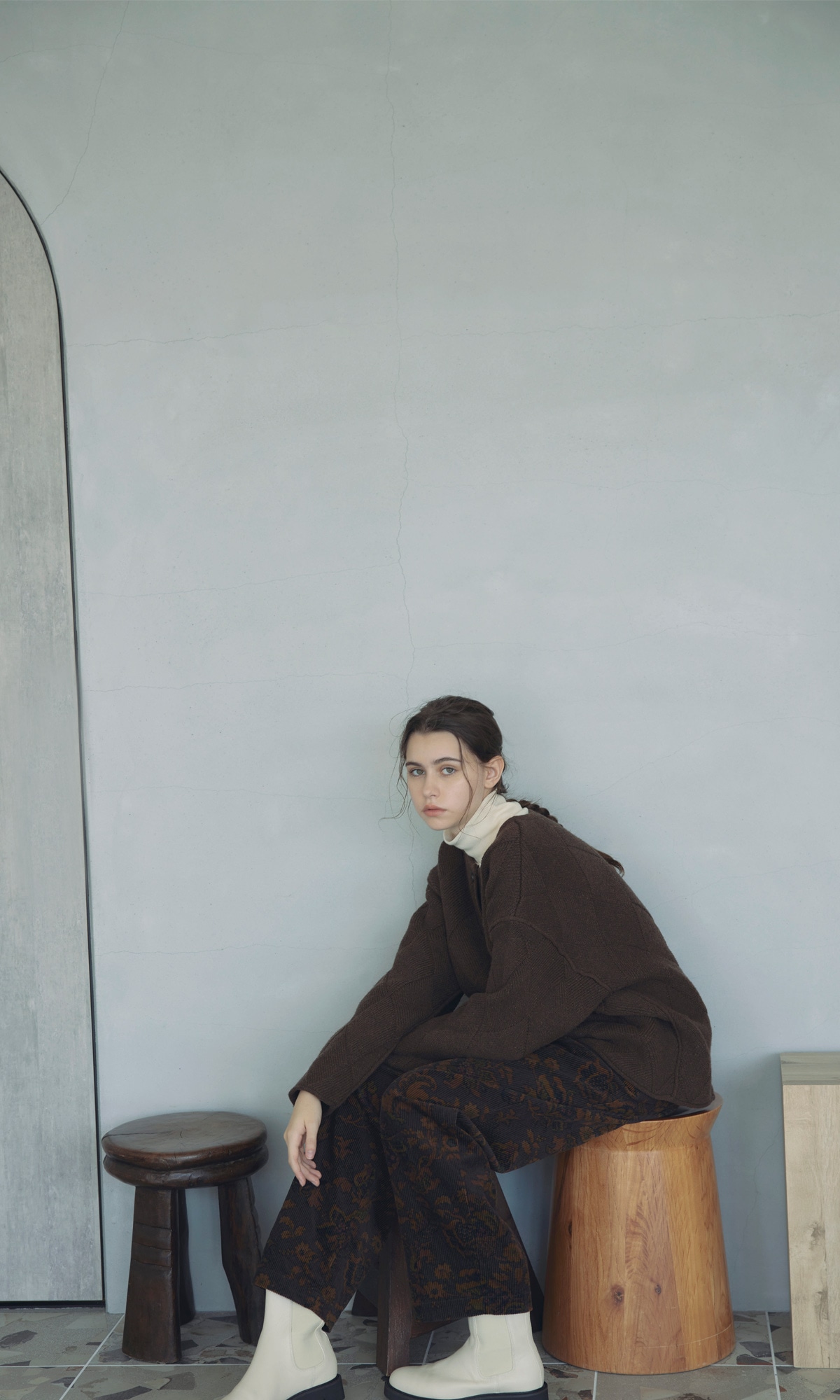ポコポコとした表情のイエローニットをアクセントにプラスして。