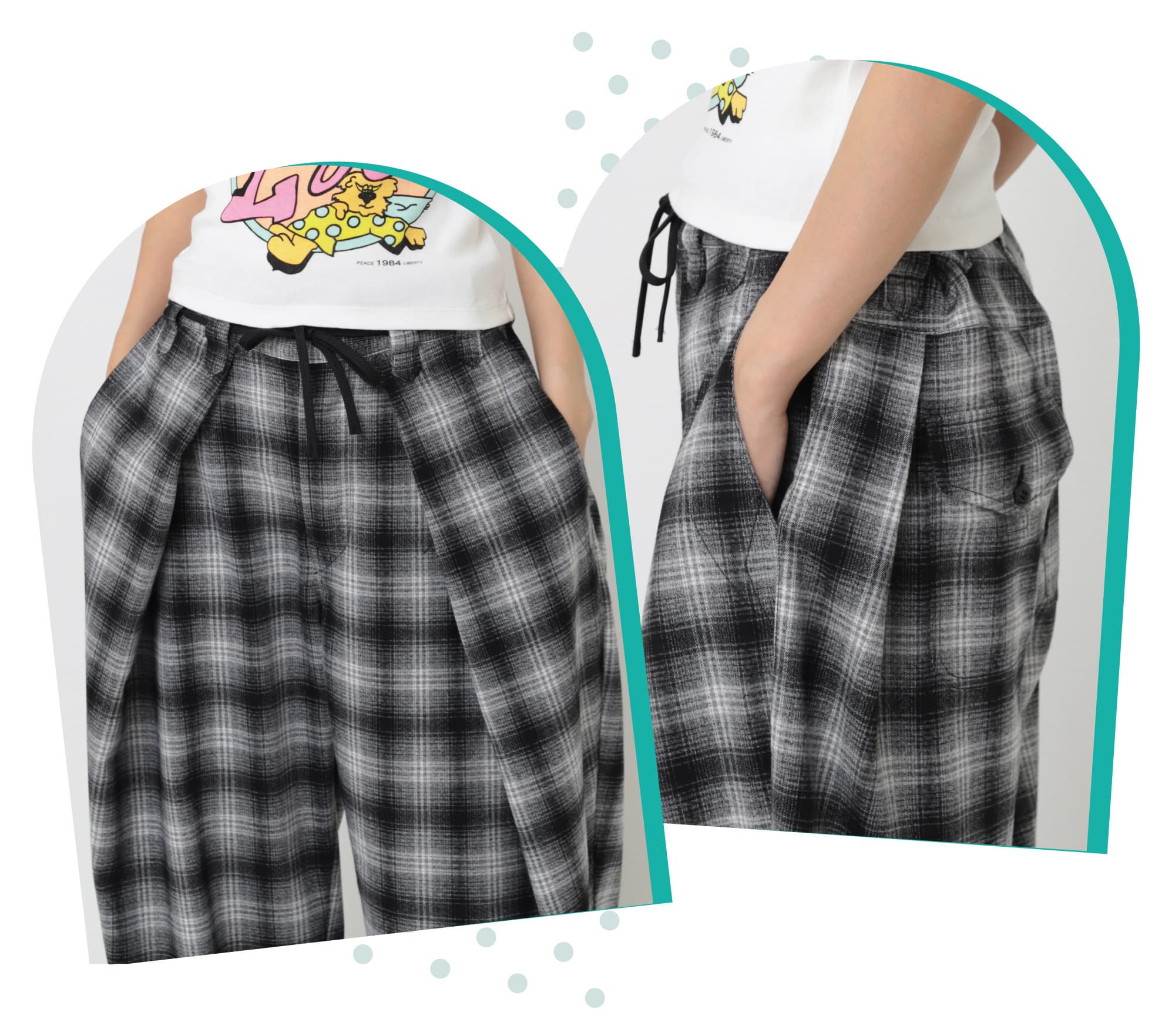 カラフルなプリントキャミを透け感のあるショートフーディから覗かせたスタイリング。ボトムスにはモノトーンのチェックパンツを選んで コーデの引き締め役に。少しハイウエストなデザインのボリュームあるパンツなのでショート丈のトップスとの相性も抜群。
