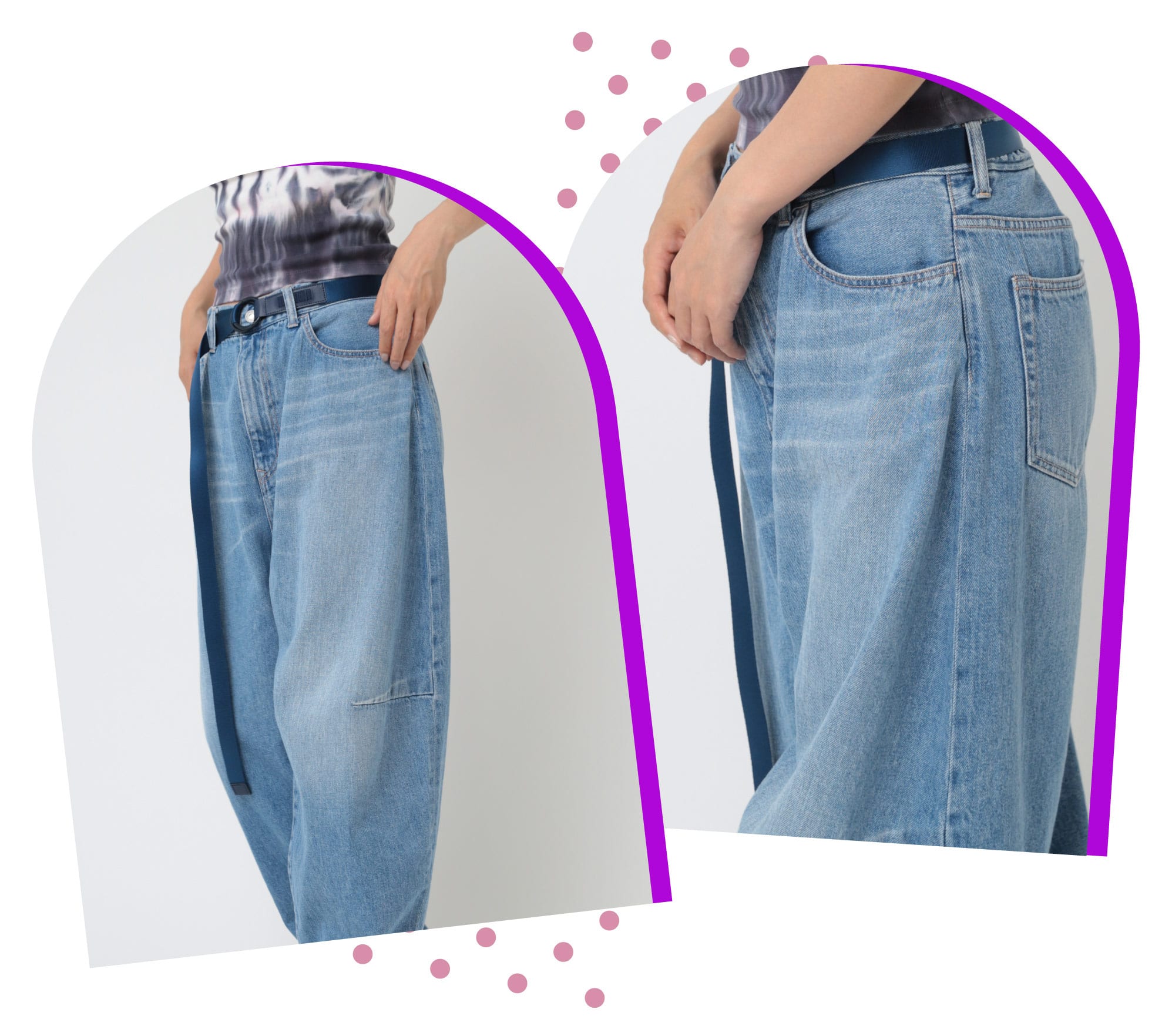 ヴィンテージジーンズ特有のねじれをデフォルメした左右非対称のデザイン。少し張りのある素材を使用していてロールアップして履くのがバルーンシルエットが際立つおすすめの穿き方。
