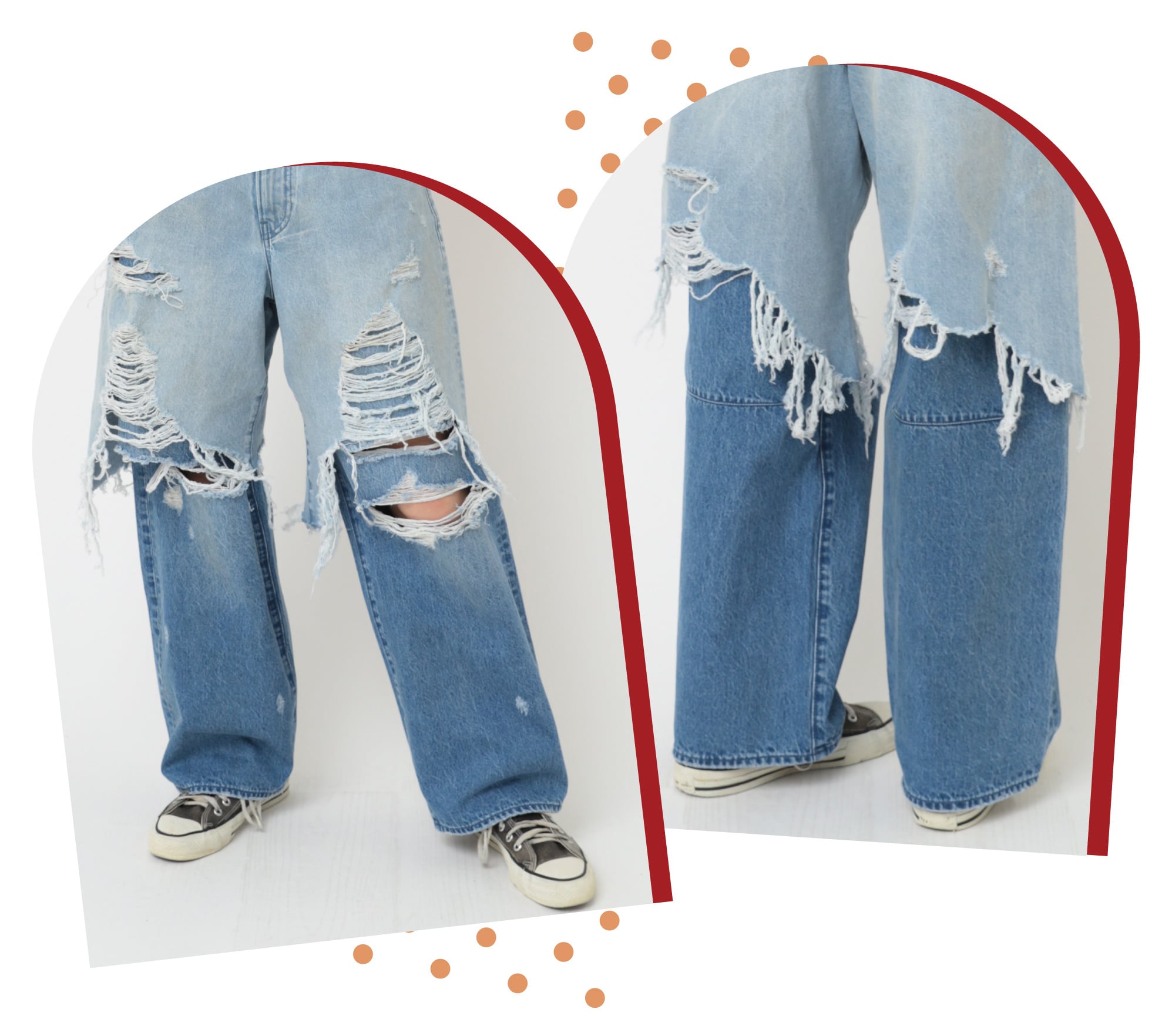 サスペンダーを肩掛けしたり、ベルトを通して楽しめる着回しが効くラップスカートと、脚のラインがスッキリみえるよう"こだわり"を詰め込んだパンツ。レイヤードを想定して作られているのでダメージ加工の位置やサイズ感など重ねたときの一体感も持ち味。