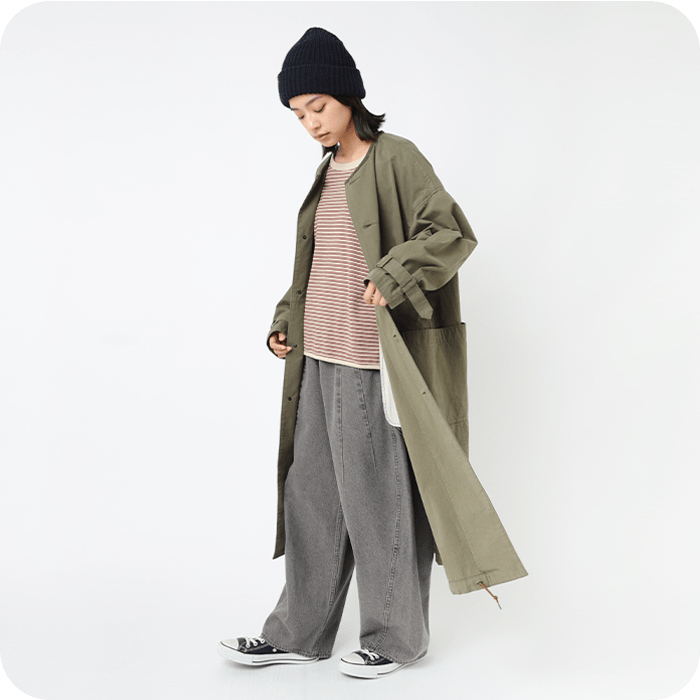 こだわりを詰め込んだアーミーコートとシルエットがたまらないクラフトマンパンツは、どこかストリートスナップな雰囲気?使えば使うほど愛着が湧いて、ずっと寄り添ってくれるアイテム。