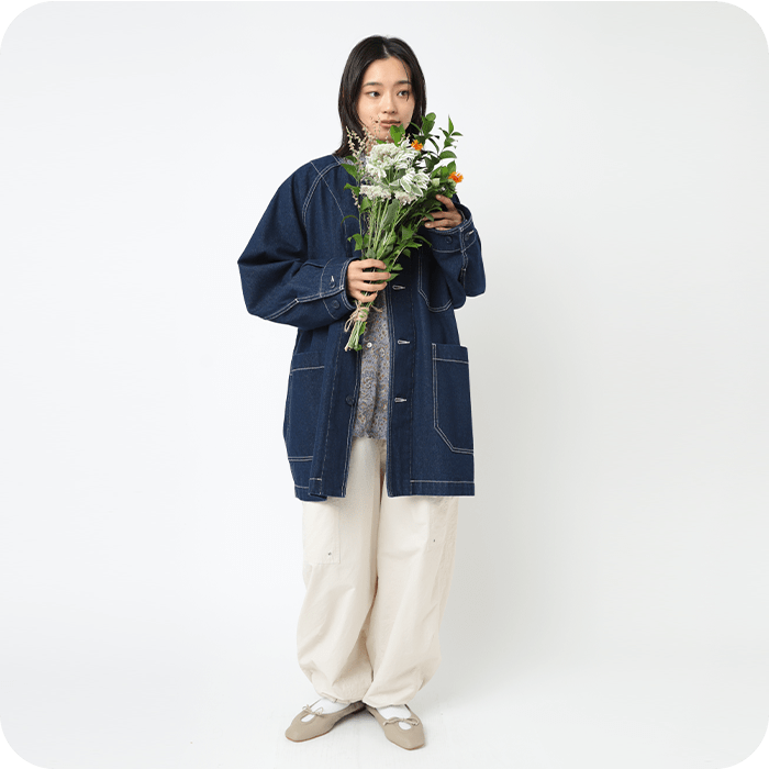 永年愛され続けているワークウェアの”カバーオール”をベースに作ったアトリエジャケット。インナーを選ばず、体型カバーにも最適なビッグシルエット。袖を折り返すと裏地のコーデュロイや、デニムならではの白糸がアクセントで心打たれること間違いなし!