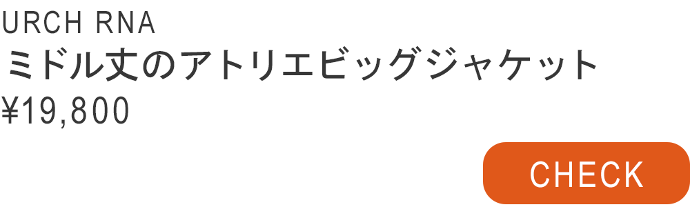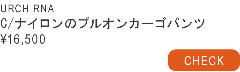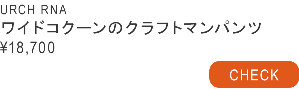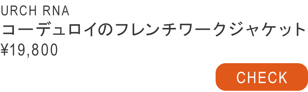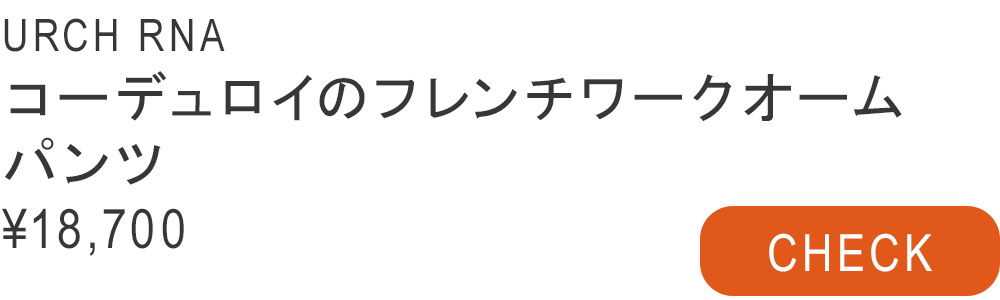 URCH RNAの中で一番ボリュームのあるオームシルエット。太い畝が特徴的な崩れにくいコーデュロイなのでずっと丸みを保ってくれるのも嬉しいポイント。ジャケット同様、シンプルなデザインに大きなポケットがTHE・URCH RNA!