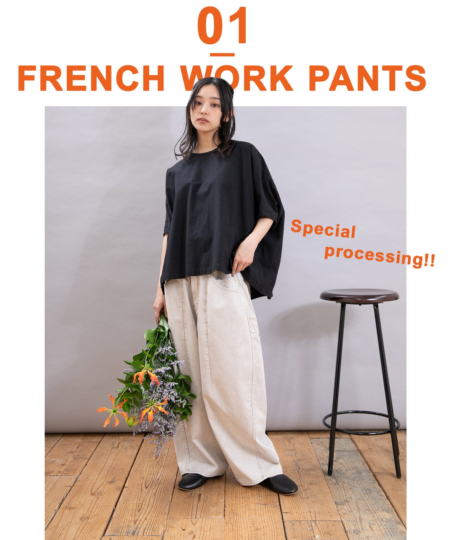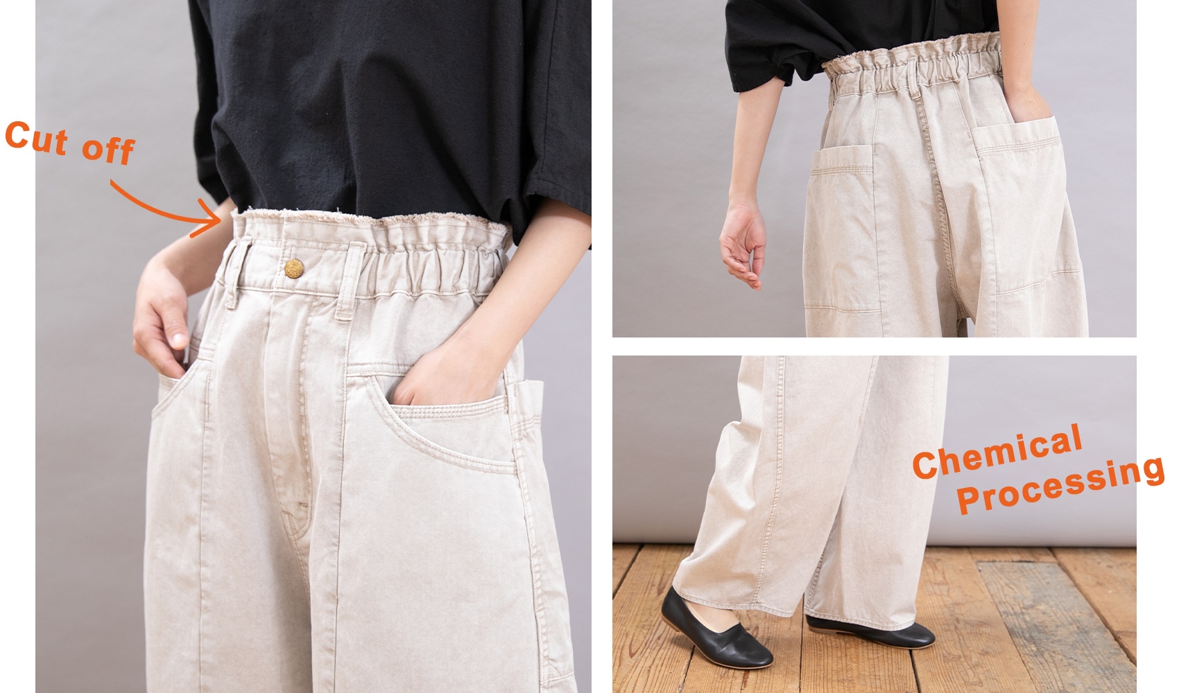 しなやかでソフトな風合いと軽さが特徴のデニムを使ったワークパンツ。 これまでの経験値と技術があるからこそデザインできた前ポケットはタックを挟んだ仕様に。 ペインターパンツを意識して、ポケットの形は四角いメンズライクなディテールに、 ウエスト端は裁ち切り仕様に仕立て、ワーク感を一層引き立てます。 |