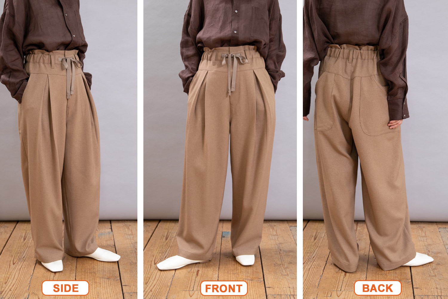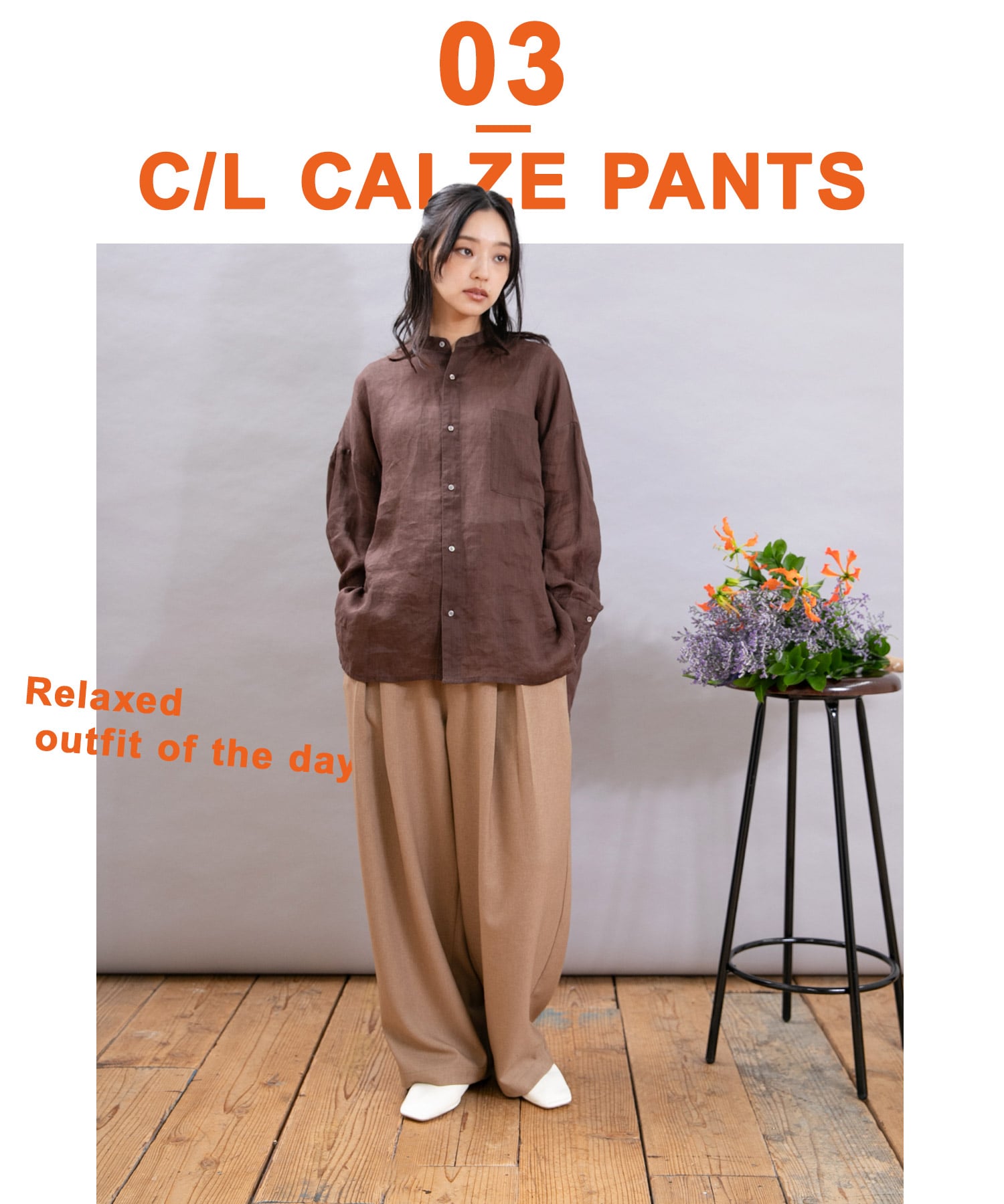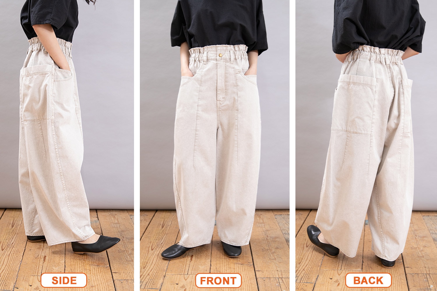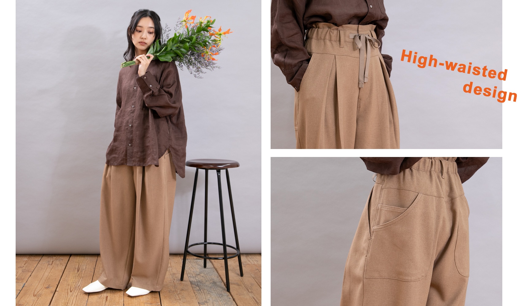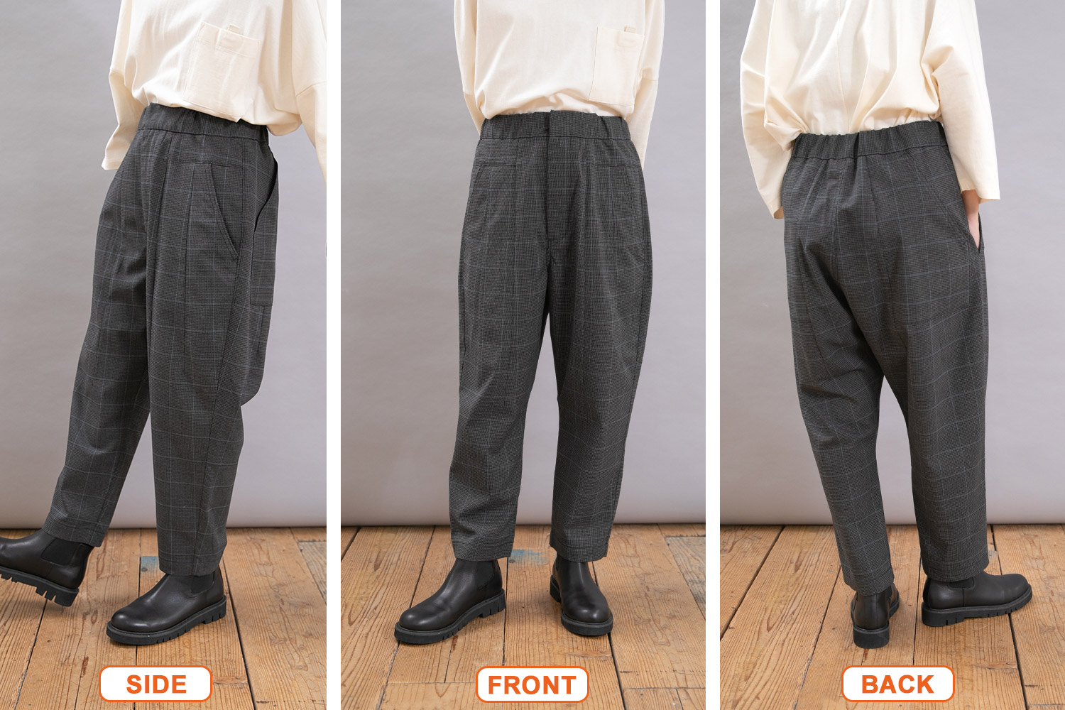 くつろぎを重視した少しゆとりのあるテーパードシルエット。 腰からヒップにかけて程よいゆとりがあり、丈はフルレングスより少し短めで、全体をすっきり見せます。 |