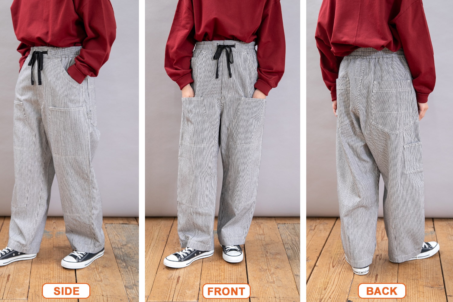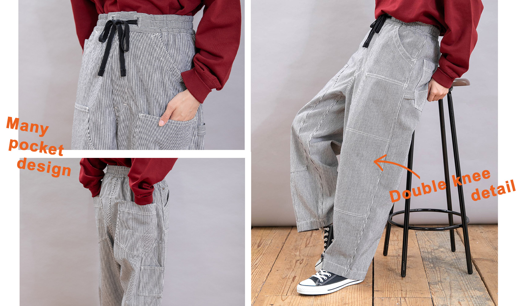 膝部分に当て布を重ねたデザインが特徴のダブルニーアトリエパンツ。 ちりばめられた7つのポケットは遊び心のあるデザインに加えて耐久性にも優れ、 見た目だけでなく実用性のあるワークテイストなデザインに。 ウエストはゴムとドロストコードで簡単に調節でき 体型を気にせずキレイに穿くことができるパンツ。 |