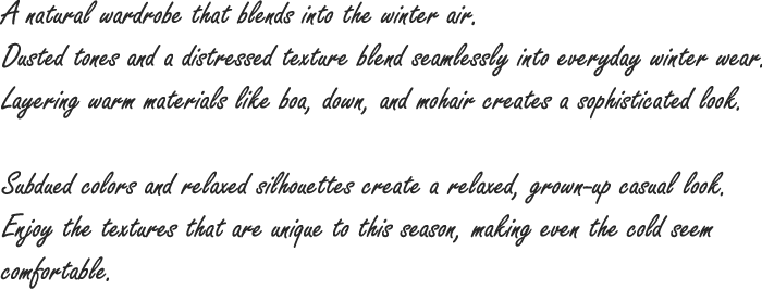 くすんだトーンやユーズド感のある風合いが、冬の日常にしっとりと馴染む