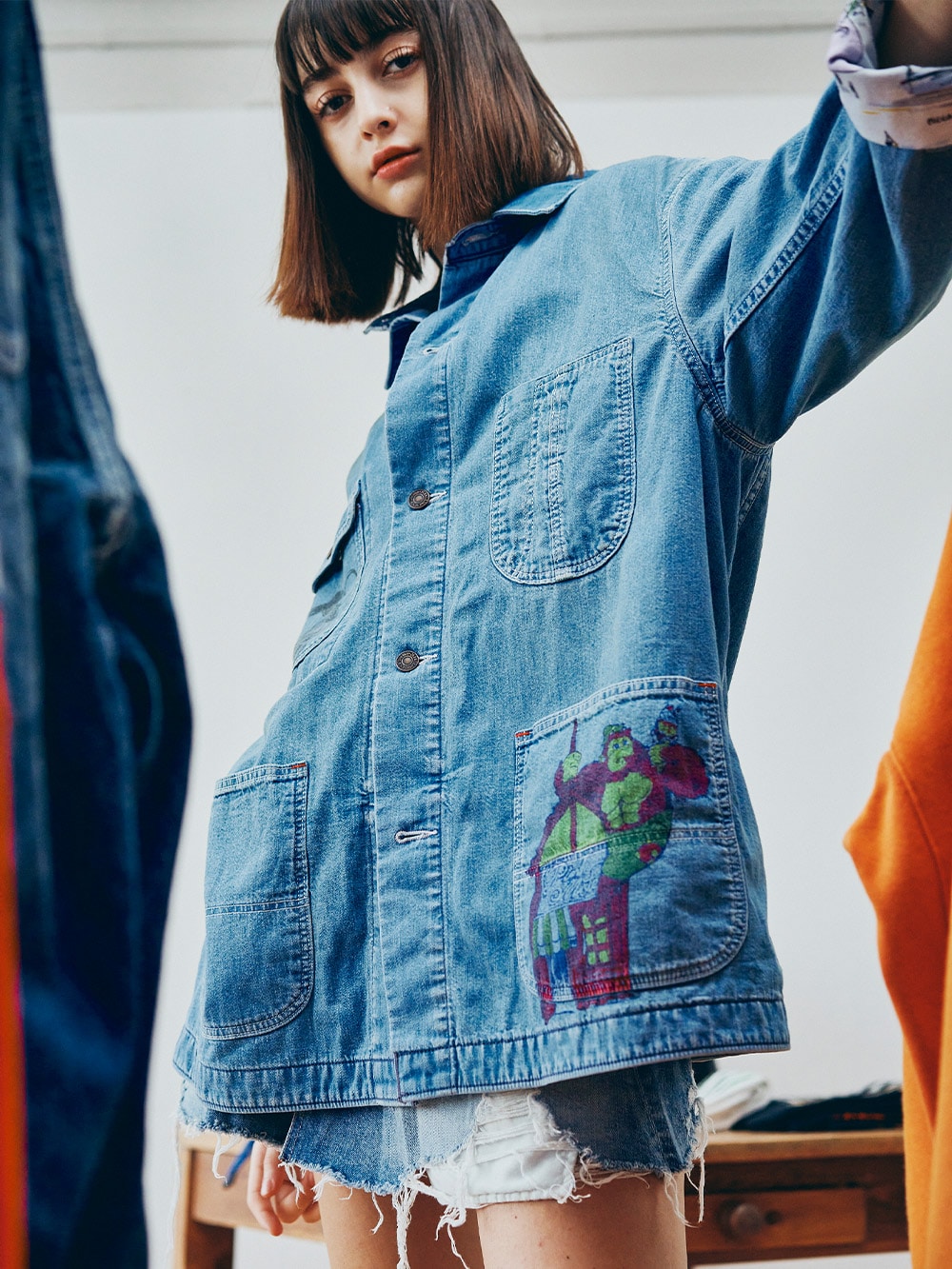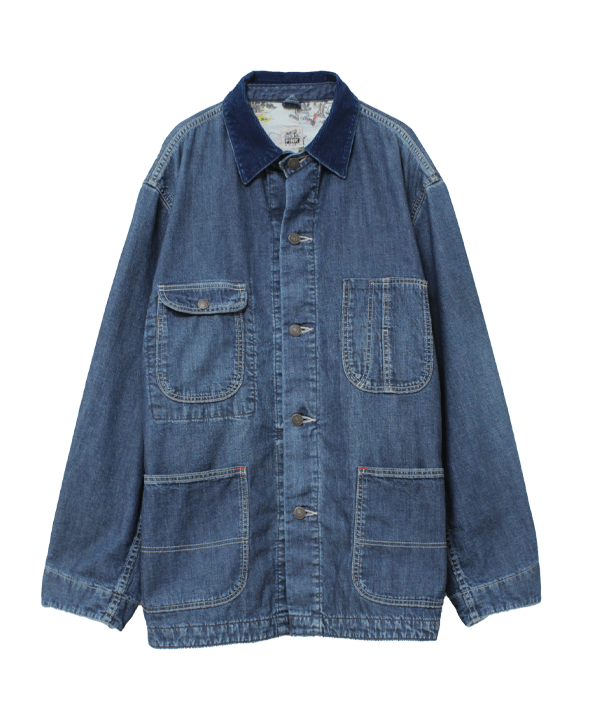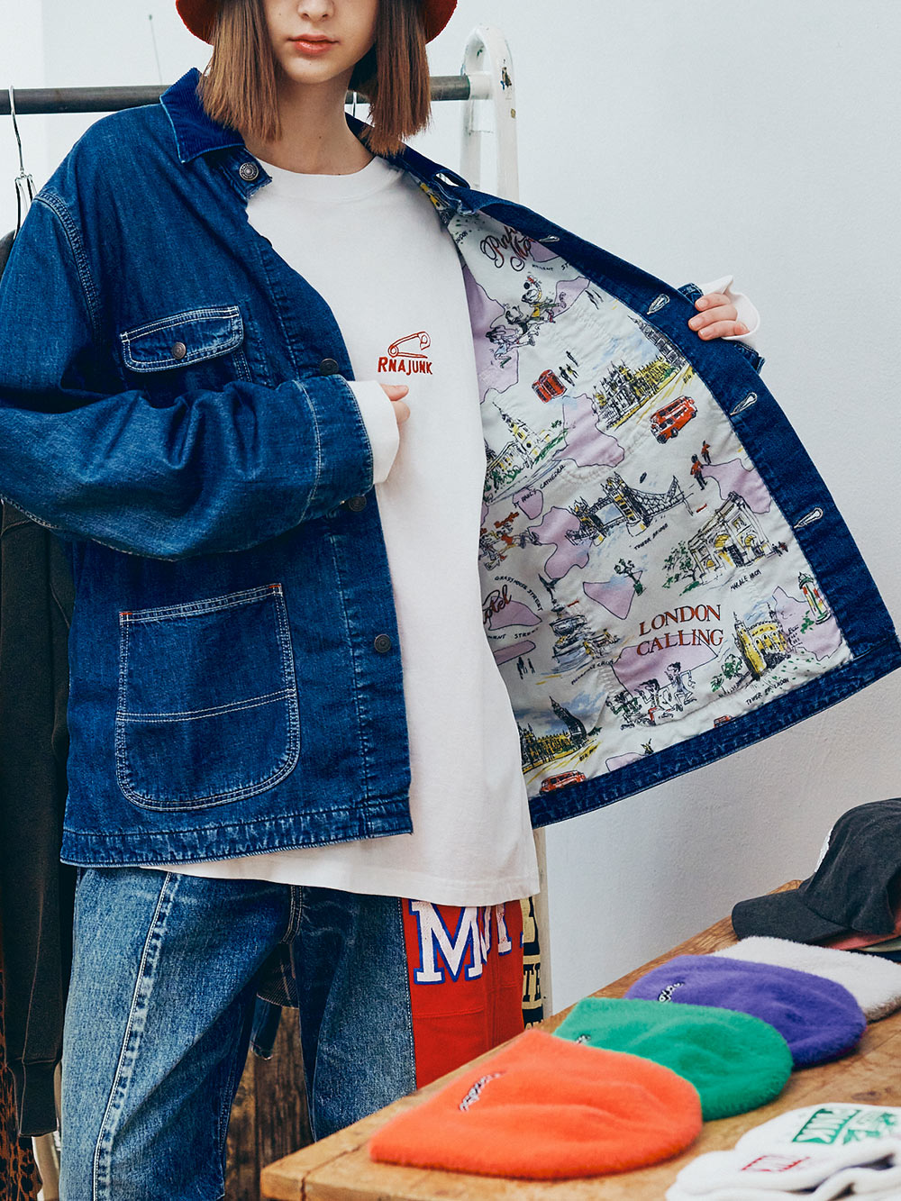 アメリカ製ヴィンテージカバーオールをベースに、現代の気分に合わせてアップデートした一着。 ややワイドな身頃と裾まわりのルーズなサイズ感で、軽快に着こなせます。襟元にはインディゴ染めのコーデュロイをあしらい、アクセントをプラスしました。縫製やステッチワークもヴィンテージ仕様を忠実に再現しています。 最大のこだわりは内側のライニング。保温性のある軽い起毛素材にオリジナルMAP柄をプリントし、見えない部分にもPINK MOTELの世界観を凝縮。袖を折り返して裏地を見せる、クールな着こなしも楽しめます。