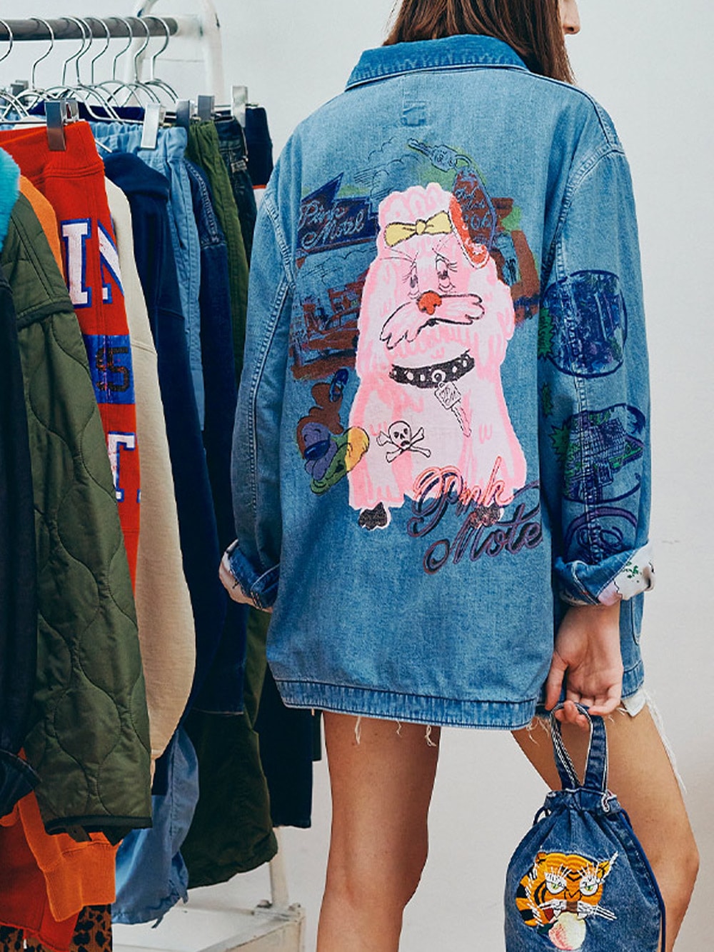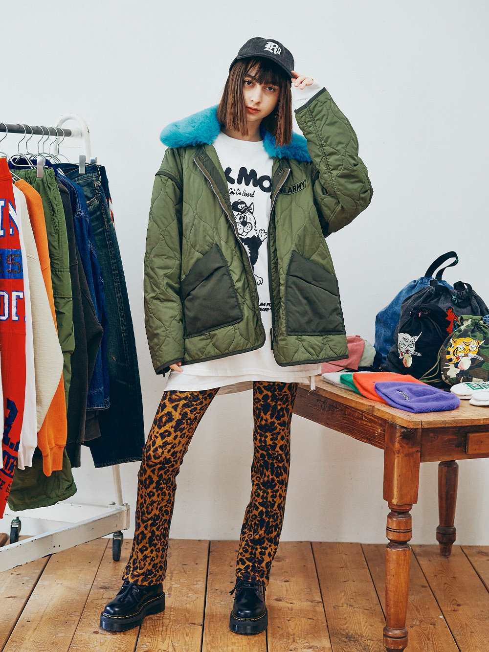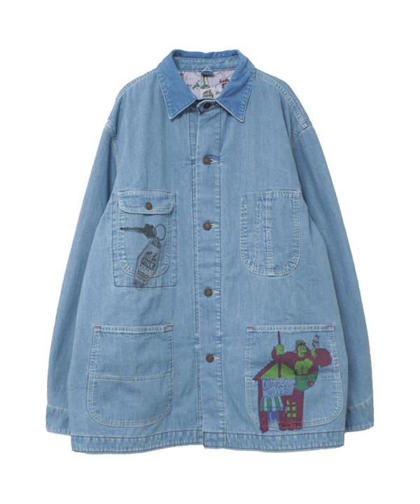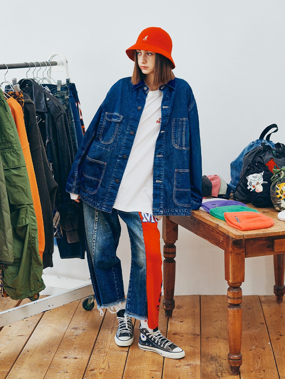 アメリカ製ヴィンテージカバーオールをベースに、現代の気分に合わせてアップデートした一着。 ややワイドな身頃と裾まわりのルーズなサイズ感で、軽快に着こなせます。襟元にはインディゴ染めのコーデュロイをあしらい、アクセントをプラスしました。縫製やステッチワークもヴィンテージ仕様を忠実に再現しています。 最大のこだわりは内側のライニング。保温性のある軽い起毛素材にオリジナルMAP柄をプリントし、見えない部分にもPINK MOTELの世界観を凝縮。袖を折り返して裏地を見せる、クールな着こなしも楽しめます。