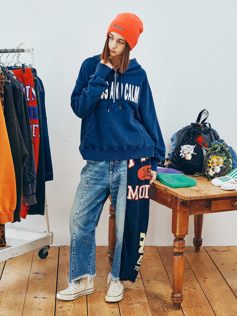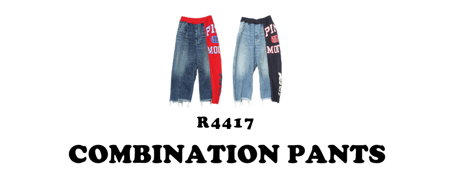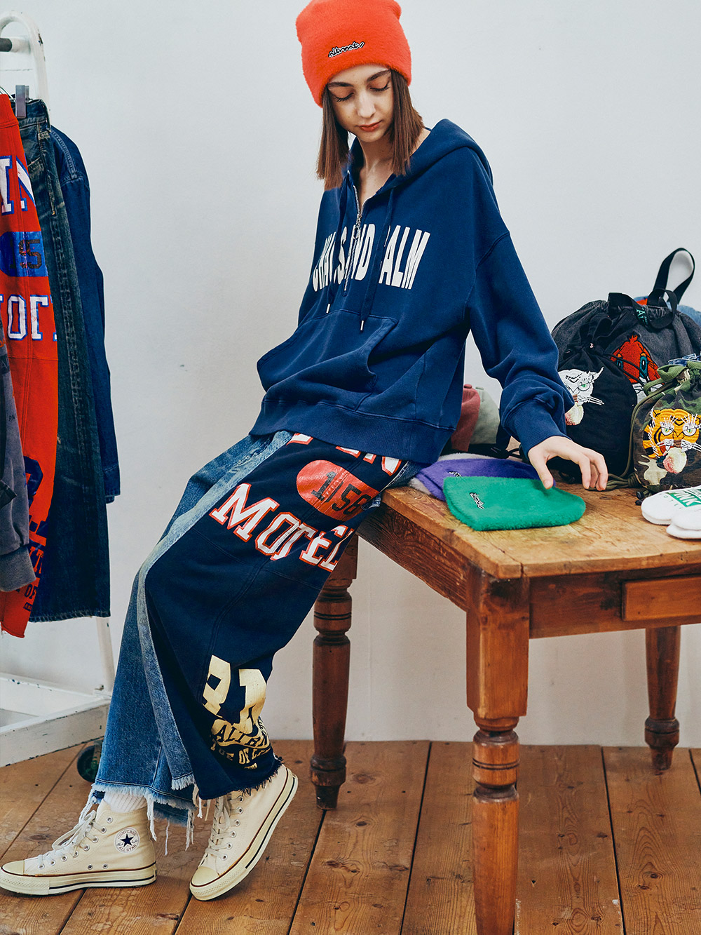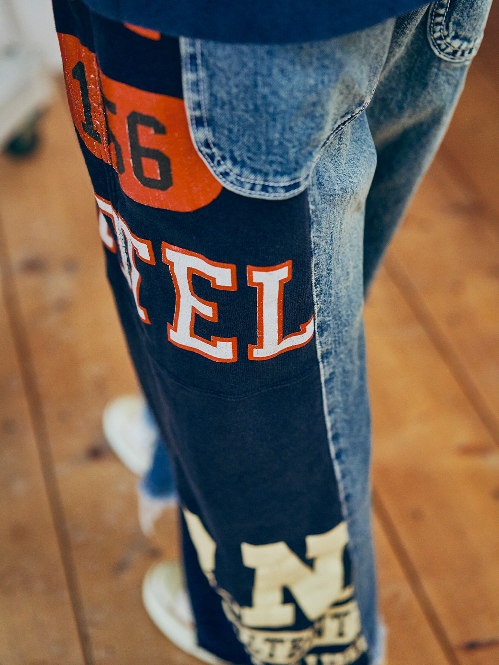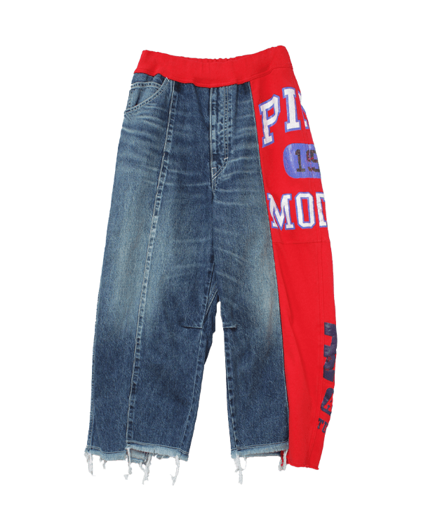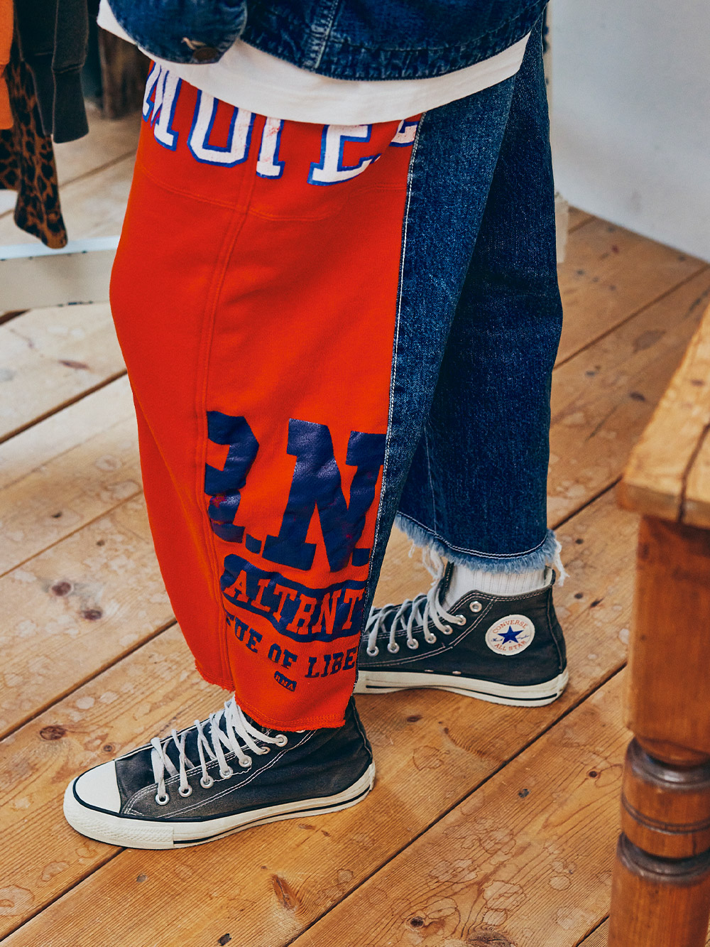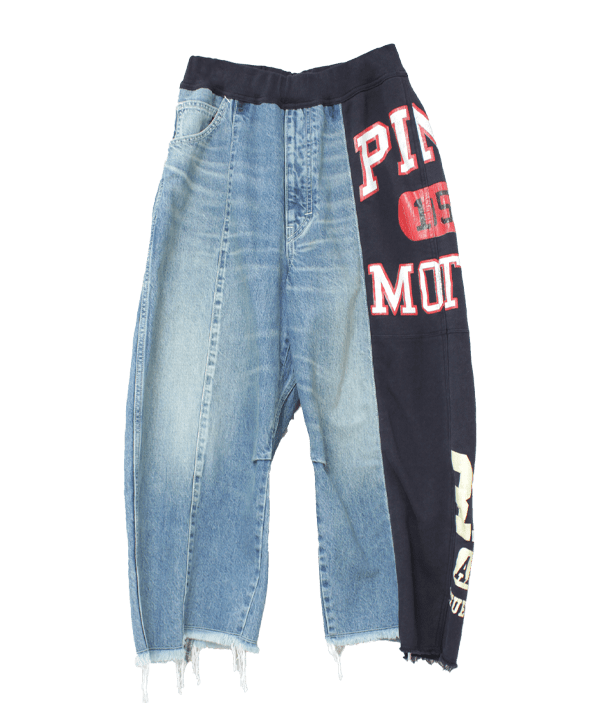 ワークパンツ、裏毛スウェット、トレーナーを組み合わせたリメイク感あふれるコラージュデザイン。 左右非対称のパッチワークや、デニムウエストに代わるトレーナーリブで、快適なイージーパンツ仕様を実現しています。 ビンテージ感のあるムラ糸デニムと裏毛の異素材コンビで、股上深めのリラックスルーズシルエットが女性らしい曲線を描きます。 手間をかけた加工でブランドの個性を凝縮した、主役級の一本です。