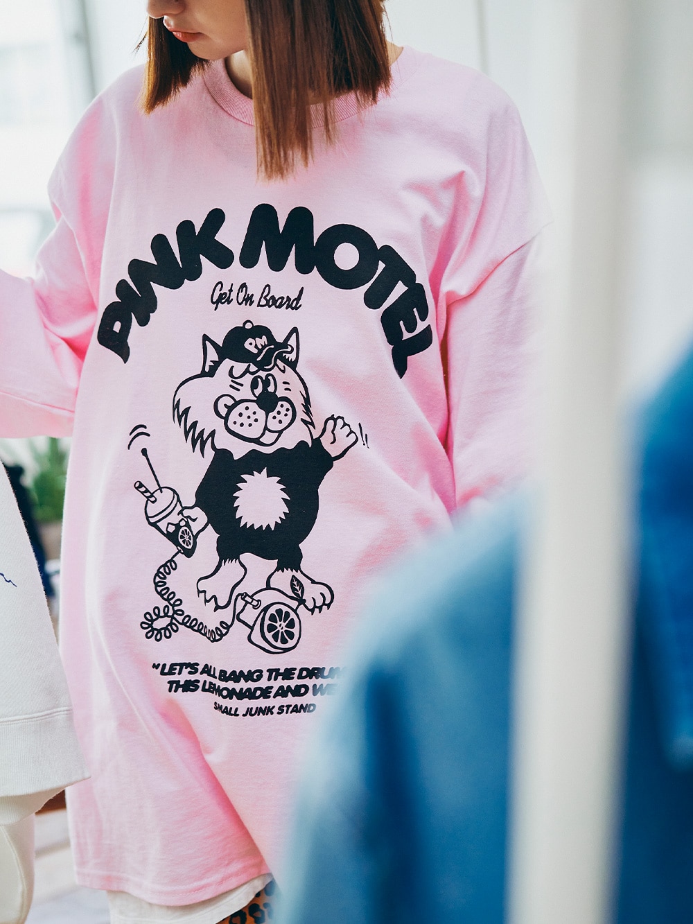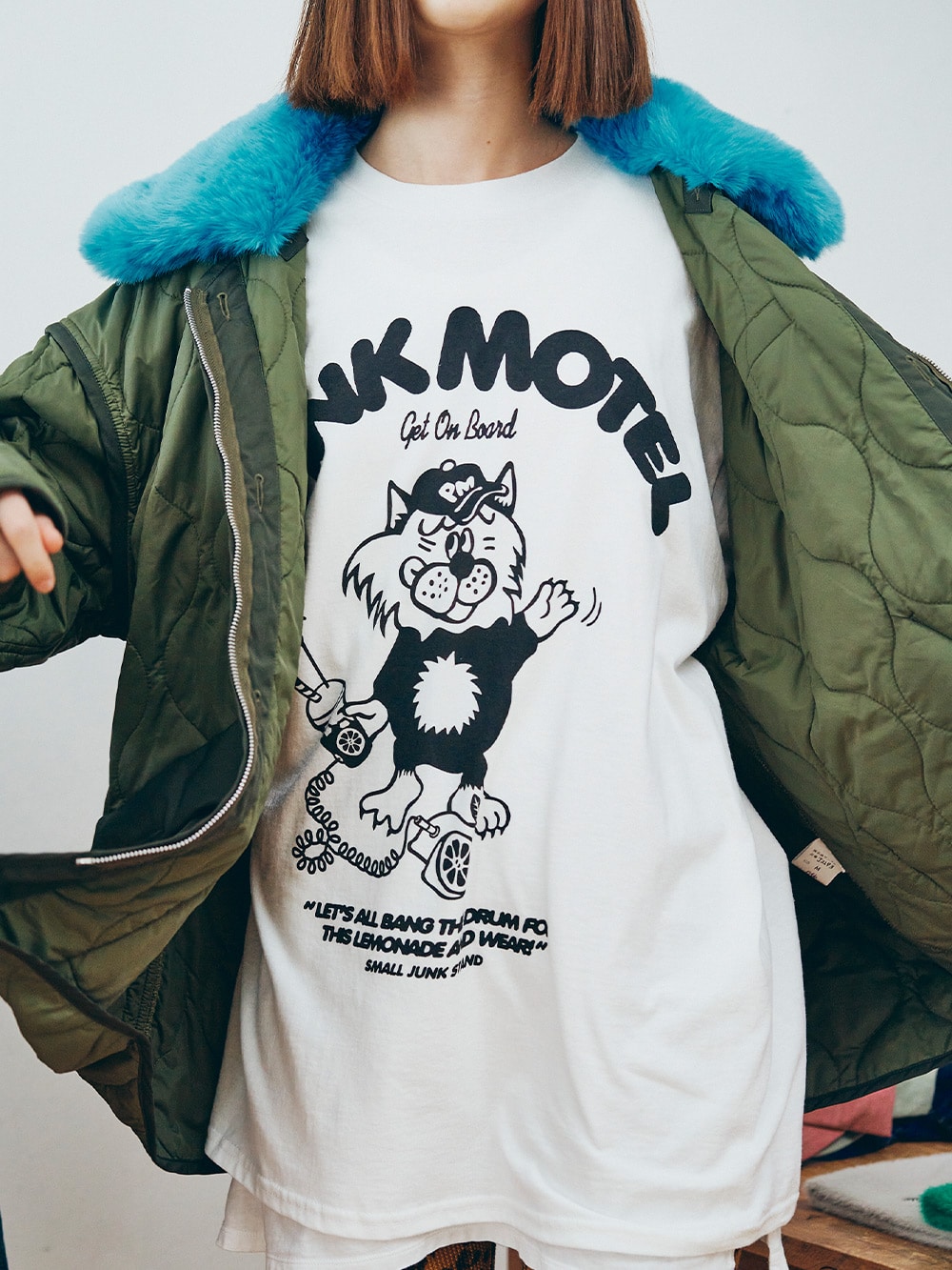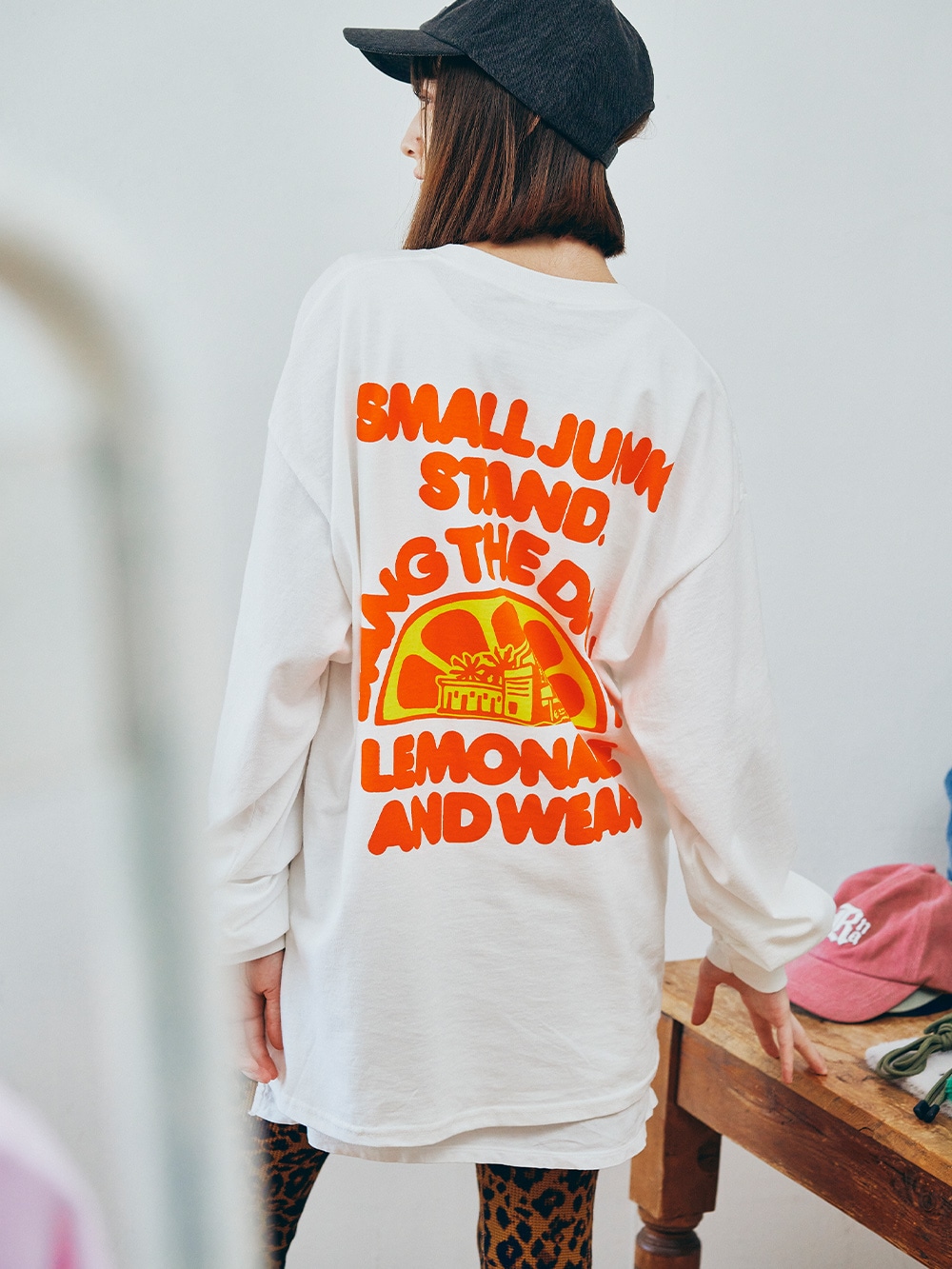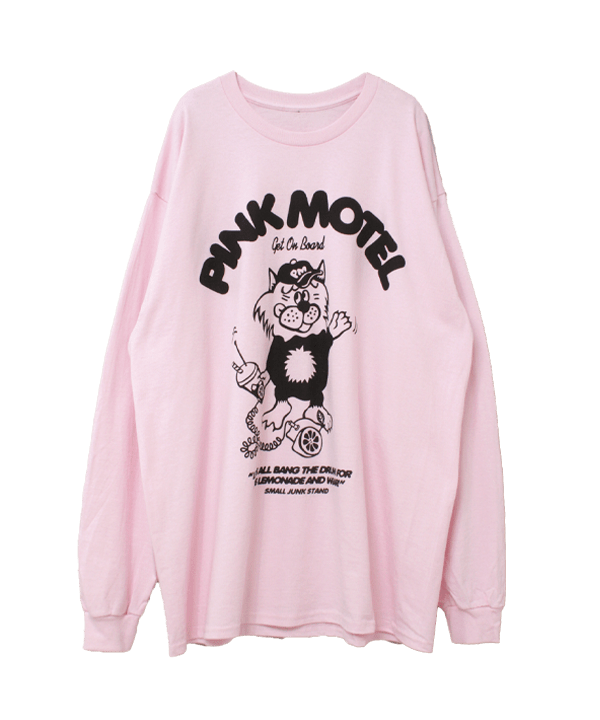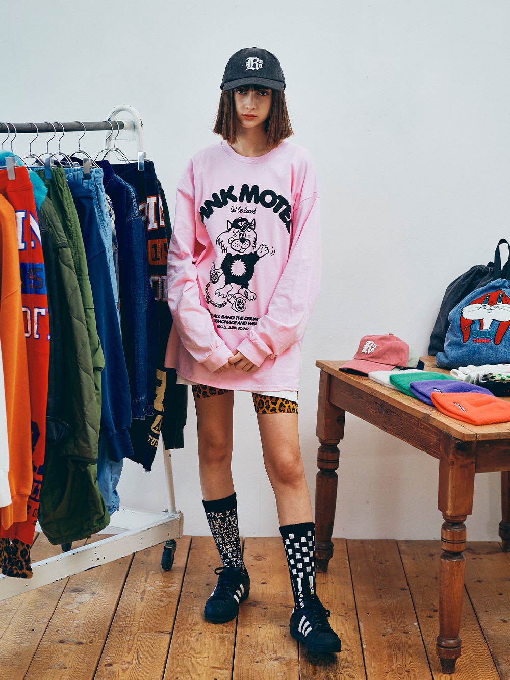 ふらっと現れる小さなユーズド屋台“SMALL JUNK STAND”の空気感を、一枚に閉じ込めたロンT。 フロントには、レモネードスタンドを盛り上げるPINK MOTELベアーと、「BANGS THE DRUMS. LEMONADE AND WEAR」の呼びかけフレーズを大胆にデザイン。B級感と遊び心が混ざり合った、まさにJUNK STANDらしいビジュアルが魅力です。 屋台名物のレモネード、熱狂を煽るメッセージ、異文化ミックスの雰囲気―― どれも今回のコレクションを象徴するモチーフばかり。コレクションの入口としても存在感のあるアイテムです。