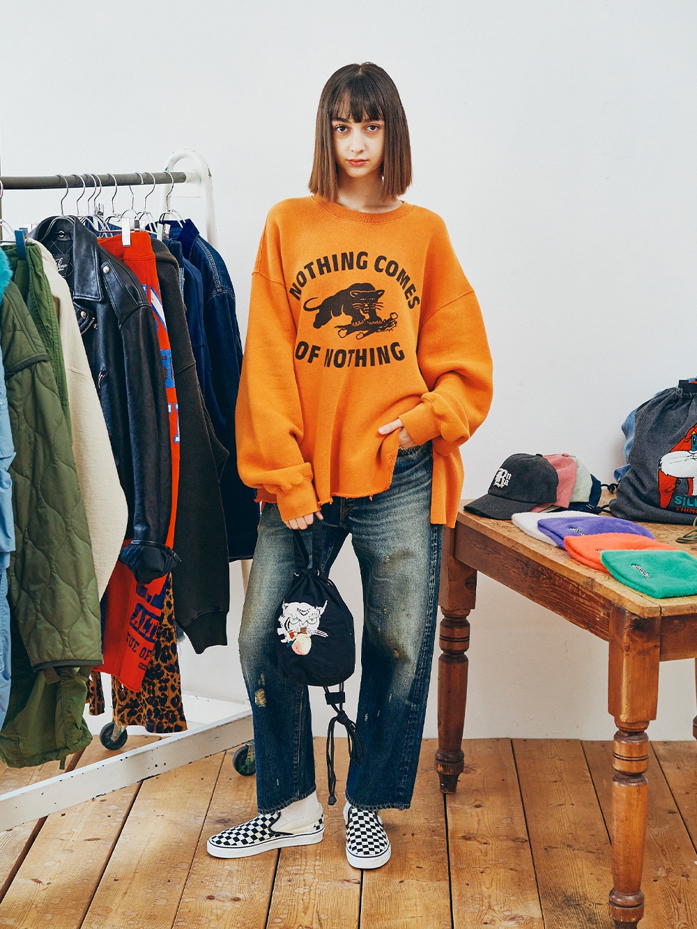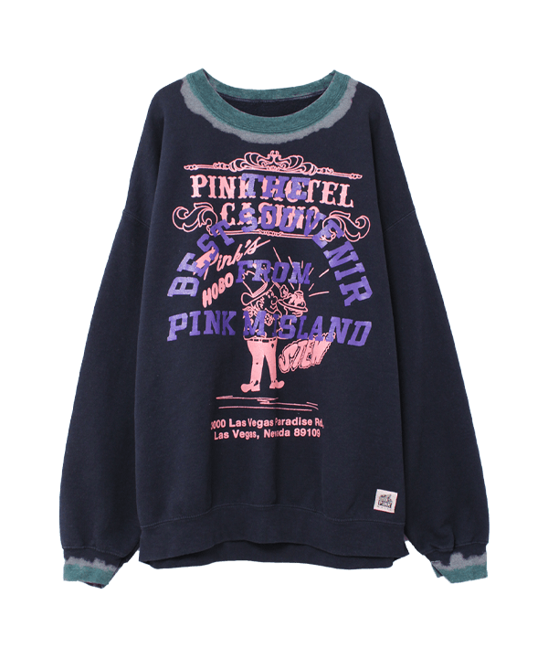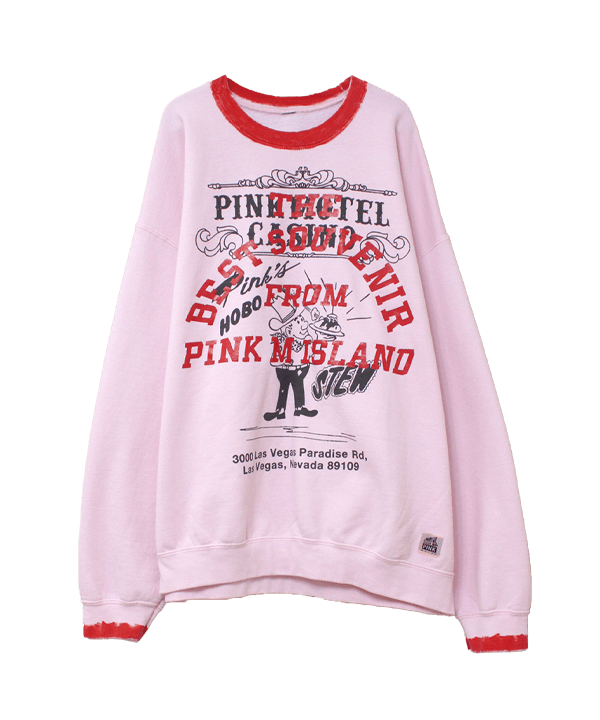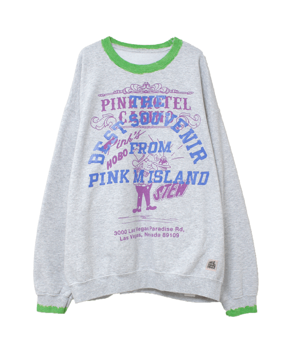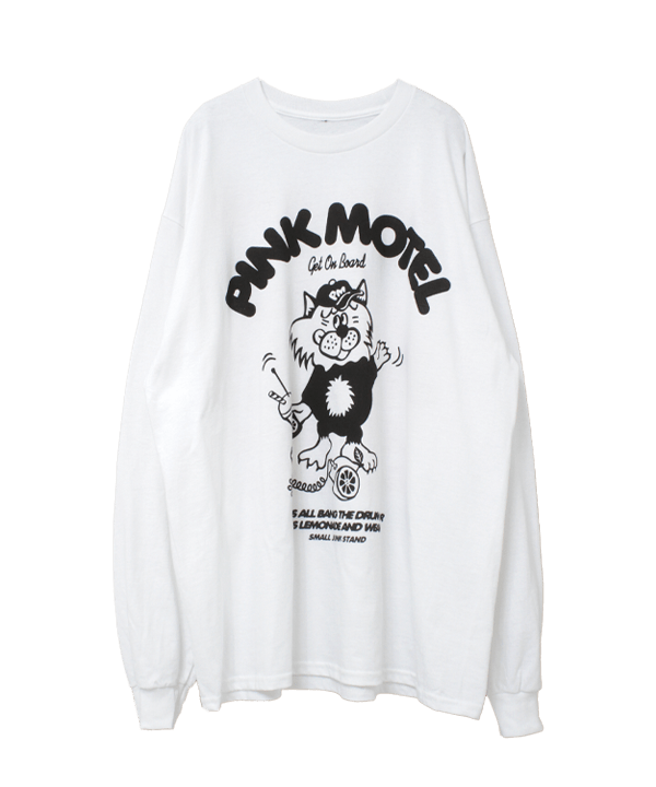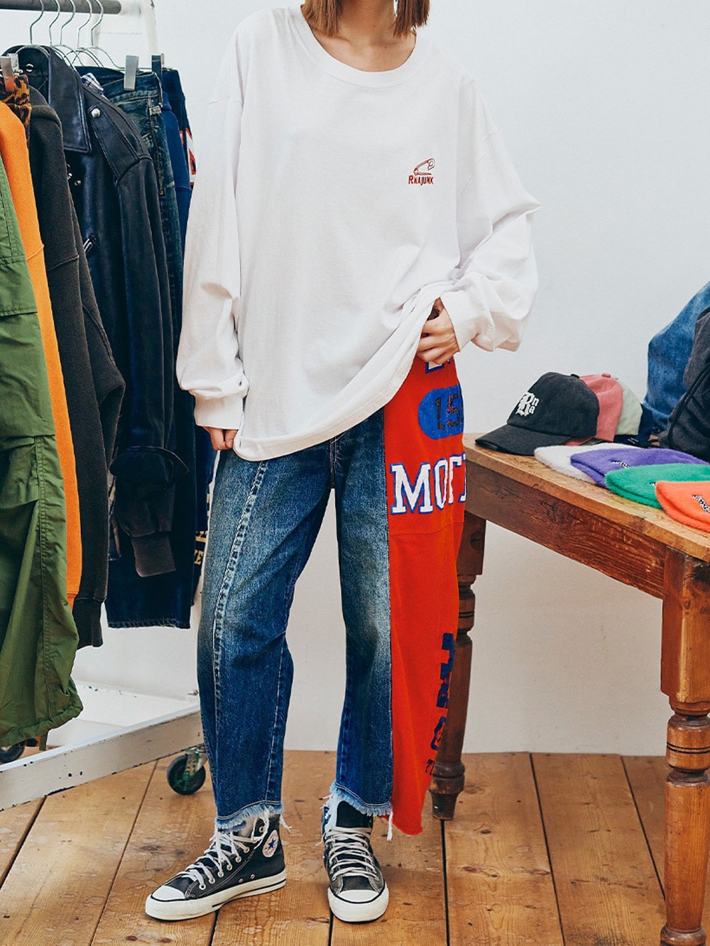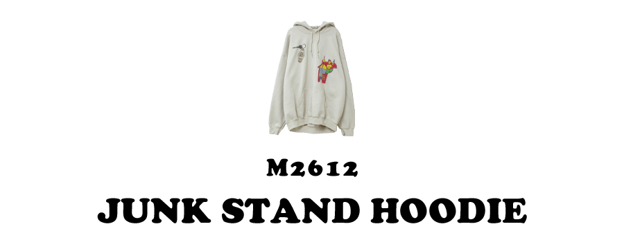 ふらっと現れる小さなユーズド屋台“SMALL JUNK STAND”の空気感を、一枚に閉じ込めたロンT。 フロントには、レモネードスタンドを盛り上げるPINK MOTELベアーと、「BANGS THE DRUMS. LEMONADE AND WEAR」の呼びかけフレーズを大胆にデザイン。B級感と遊び心が混ざり合った、まさにJUNK STANDらしいビジュアルが魅力です。 屋台名物のレモネード、熱狂を煽るメッセージ、異文化ミックスの雰囲気―― どれも今回のコレクションを象徴するモチーフばかり。コレクションの入口としても存在感のあるアイテムです。