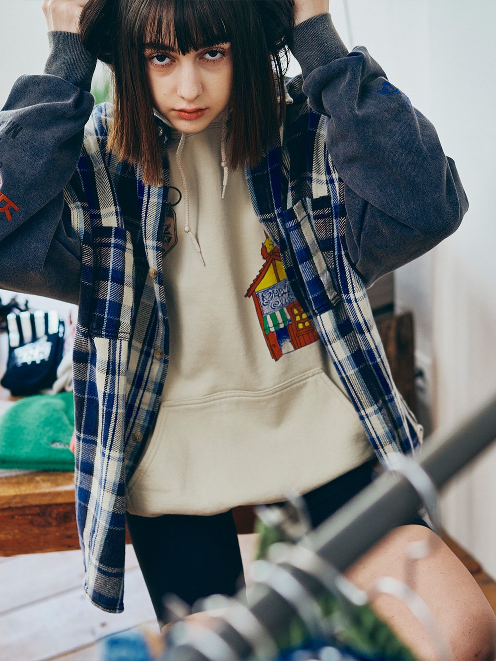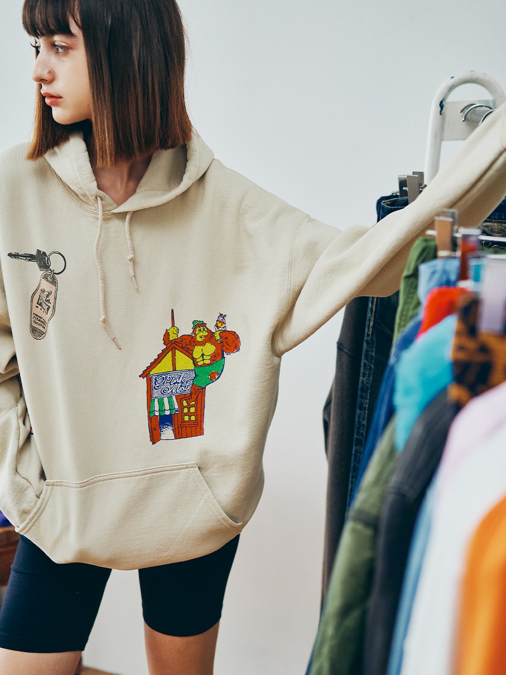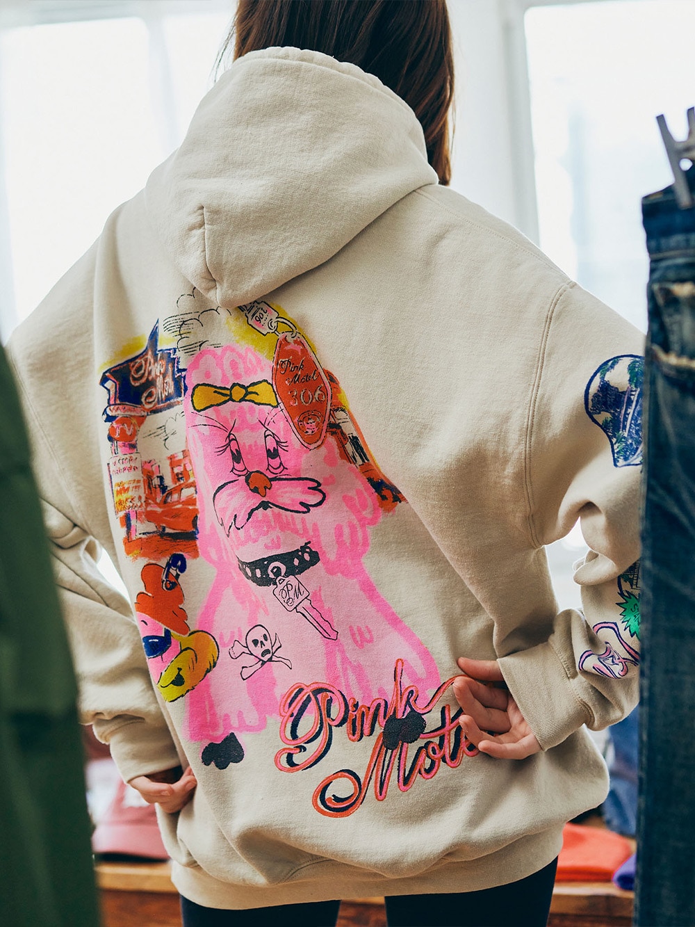 PINK MOTELが掲げる“SMALL JUNK STAND”の世界観を、そのままパーカーに落とし込んだ一着。 小さな屋台を思わせるモチーフを散りばめた複数のオリジナルメモリー柄を、全面に大胆プリントしたインパクトのあるデザインが魅力です。 国内で透明感のある顔料インクを使い、ハンドシルクスクリーンプリントで一枚ずつ丁寧に仕上げています。 さらに軽い製品洗いを施すことで、新品ながらこなれたユーズド感をプラス。一枚で主役になる存在感を持った、JUNK STANDらしいアイテムです。