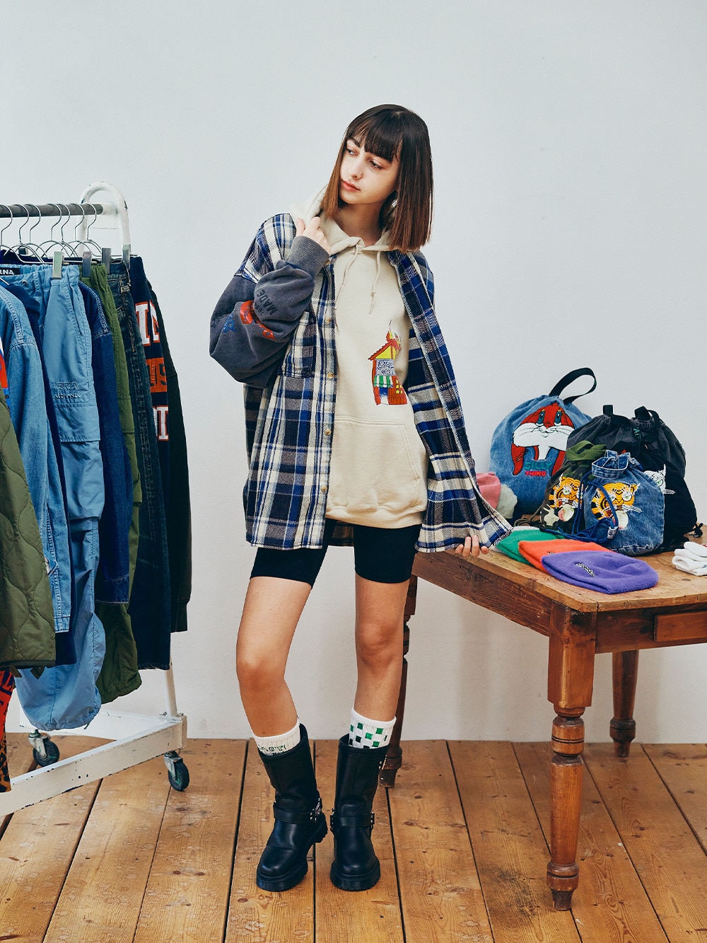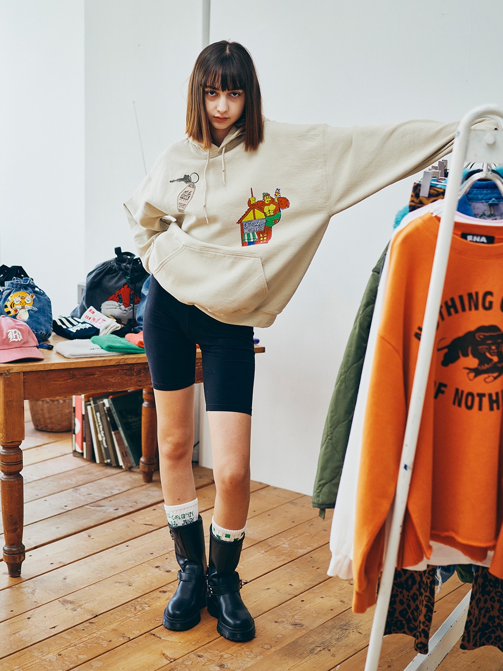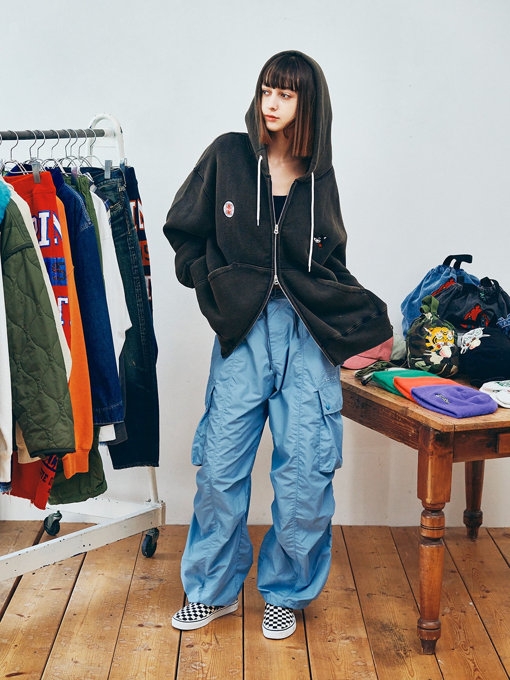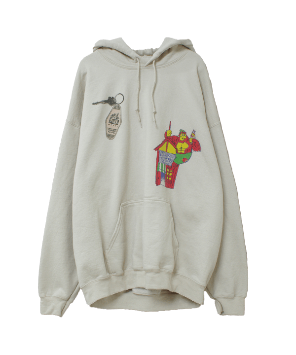 PINK MOTELが掲げる“SMALL JUNK STAND”の世界観を、そのままパーカーに落とし込んだ一着。 小さな屋台を思わせるモチーフを散りばめた複数のオリジナルメモリー柄を、全面に大胆プリントしたインパクトのあるデザインが魅力です。 国内で透明感のある顔料インクを使い、ハンドシルクスクリーンプリントで一枚ずつ丁寧に仕上げています。 さらに軽い製品洗いを施すことで、新品ながらこなれたユーズド感をプラス。一枚で主役になる存在感を持った、JUNK STANDらしいアイテムです。