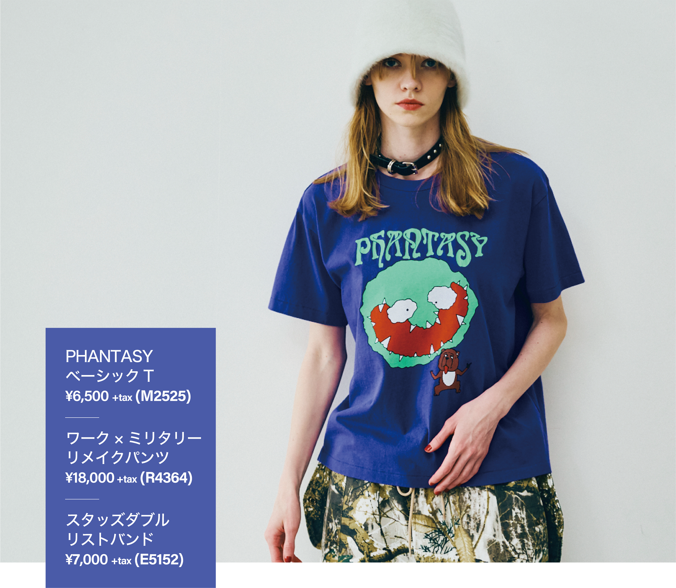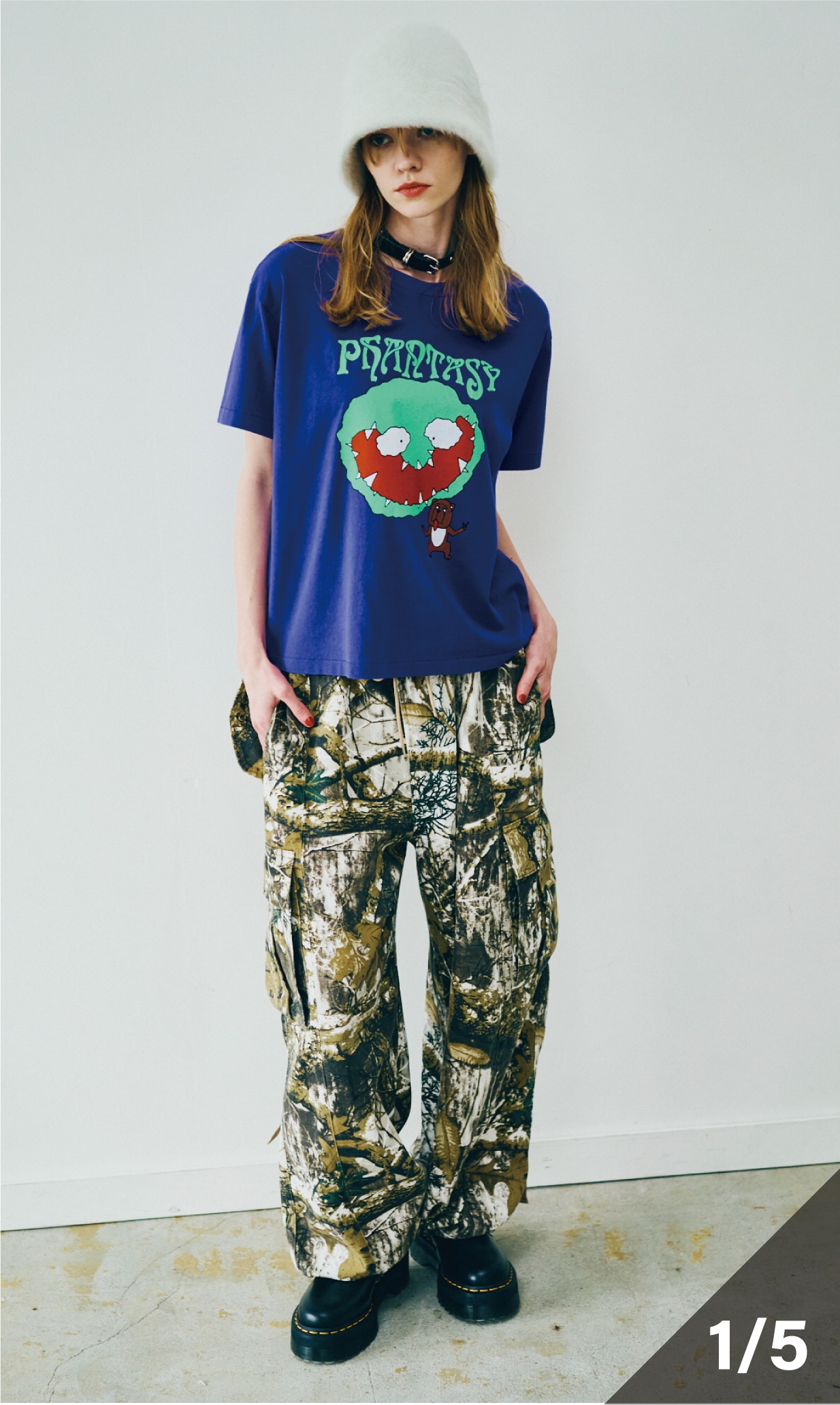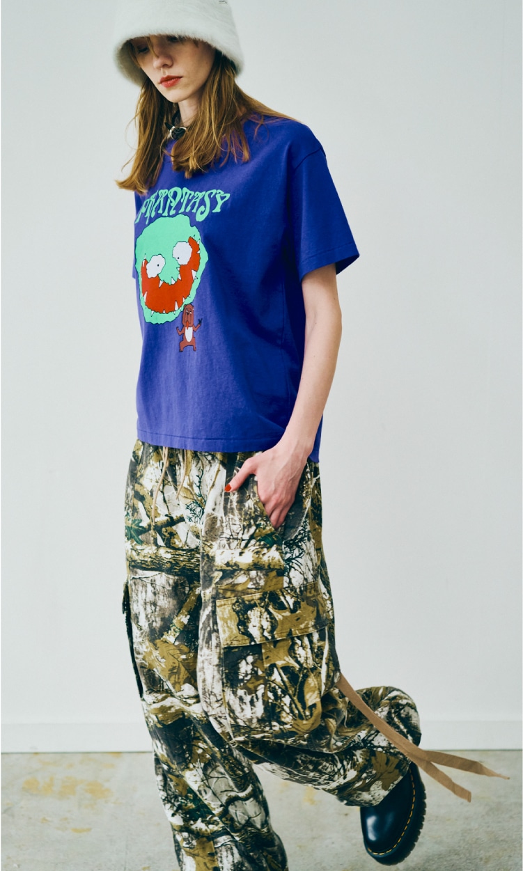 架空のバンド『PHANTASY』をイメージしたグラフィック をのせたTシャツは、音楽とストリートを感じる1枚。人気 のミリタリーパンツにツリーカモの新色を載せた、スタイリッ シュで存在感のあるボトム。RNAらしいユニセックス感と柄 のインパクトで、シンプルながら他と差がつくスタイリング。