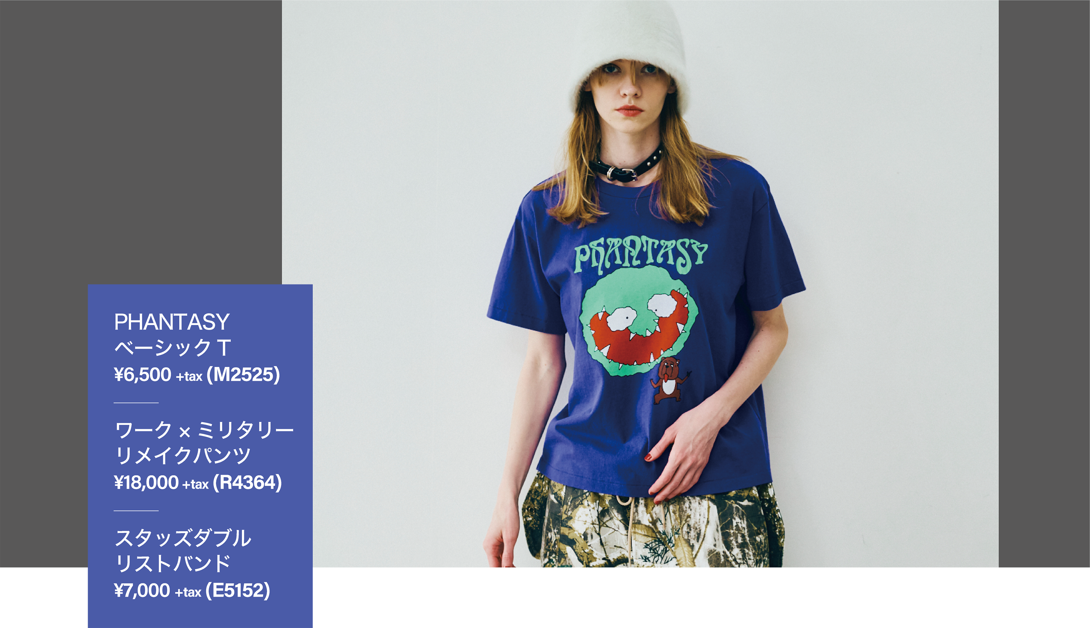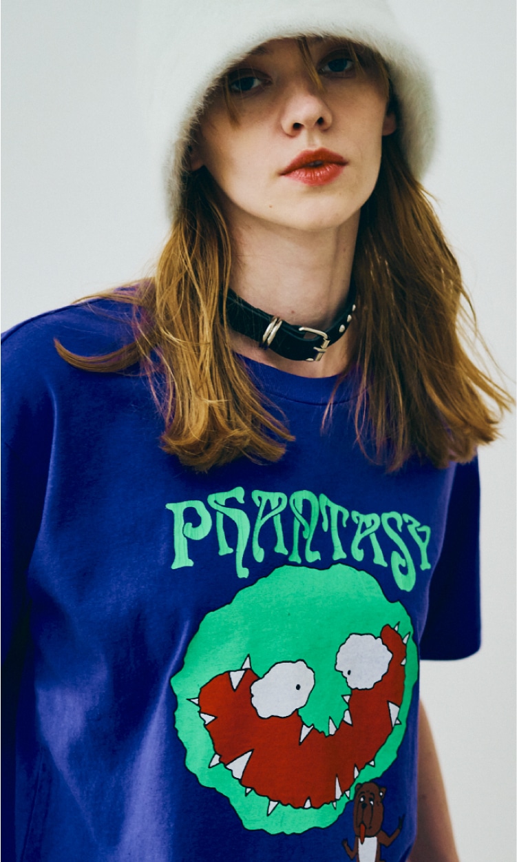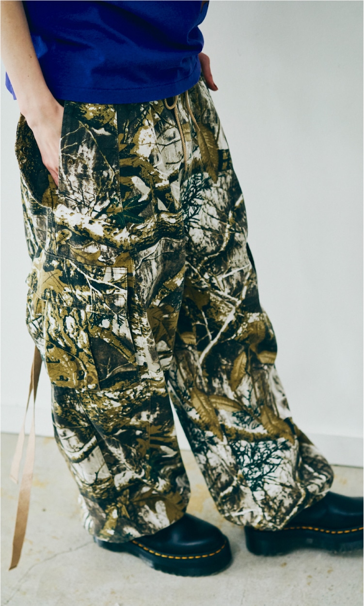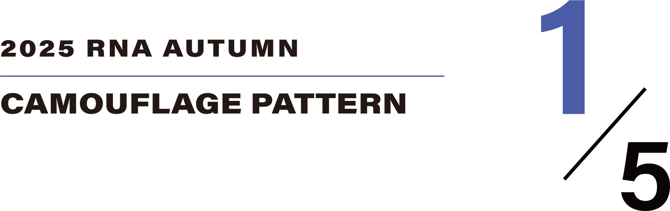 架空のバンド『PHANTASY』をイメージしたグラフィック をのせたTシャツは、音楽とストリートを感じる1枚。人気 のミリタリーパンツにツリーカモの新色を載せた、スタイリッ シュで存在感のあるボトム。RNAらしいユニセックス感と柄 のインパクトで、シンプルながら他と差がつくスタイリング。