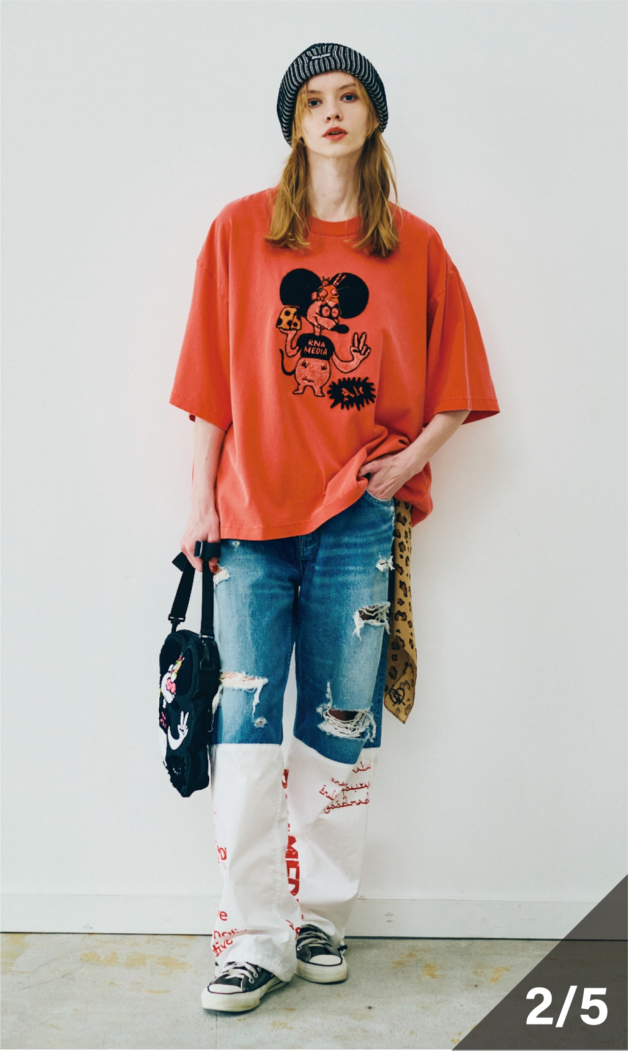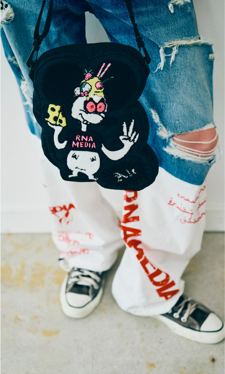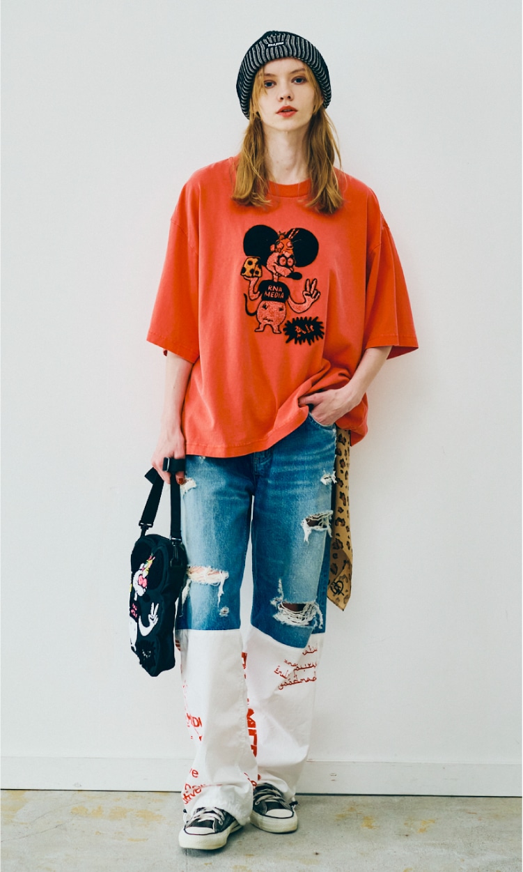 キッチュでB級感ただようキャラクターをパイル刺繍で落と し込んだワイドTに、ヴィンテージ加工のデニムとパラシュー ト素材を組み合わせたリメイクパンツを合わせた着こなし。 レオパード柄のバンダナと、Tシャツとリンクしたキャラデ ザインのバッグで、遊び心と統一感をプラス。個性が際立つ、 RNAらしいストリートスタイル。