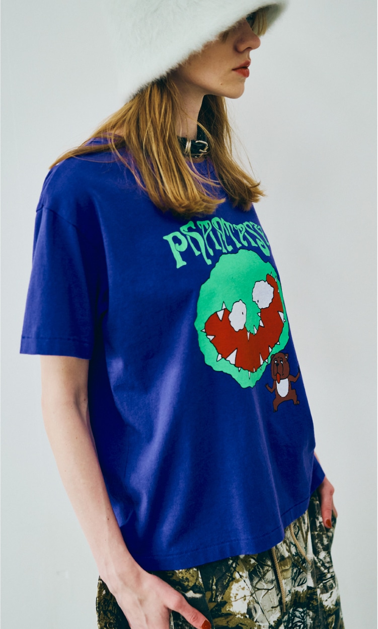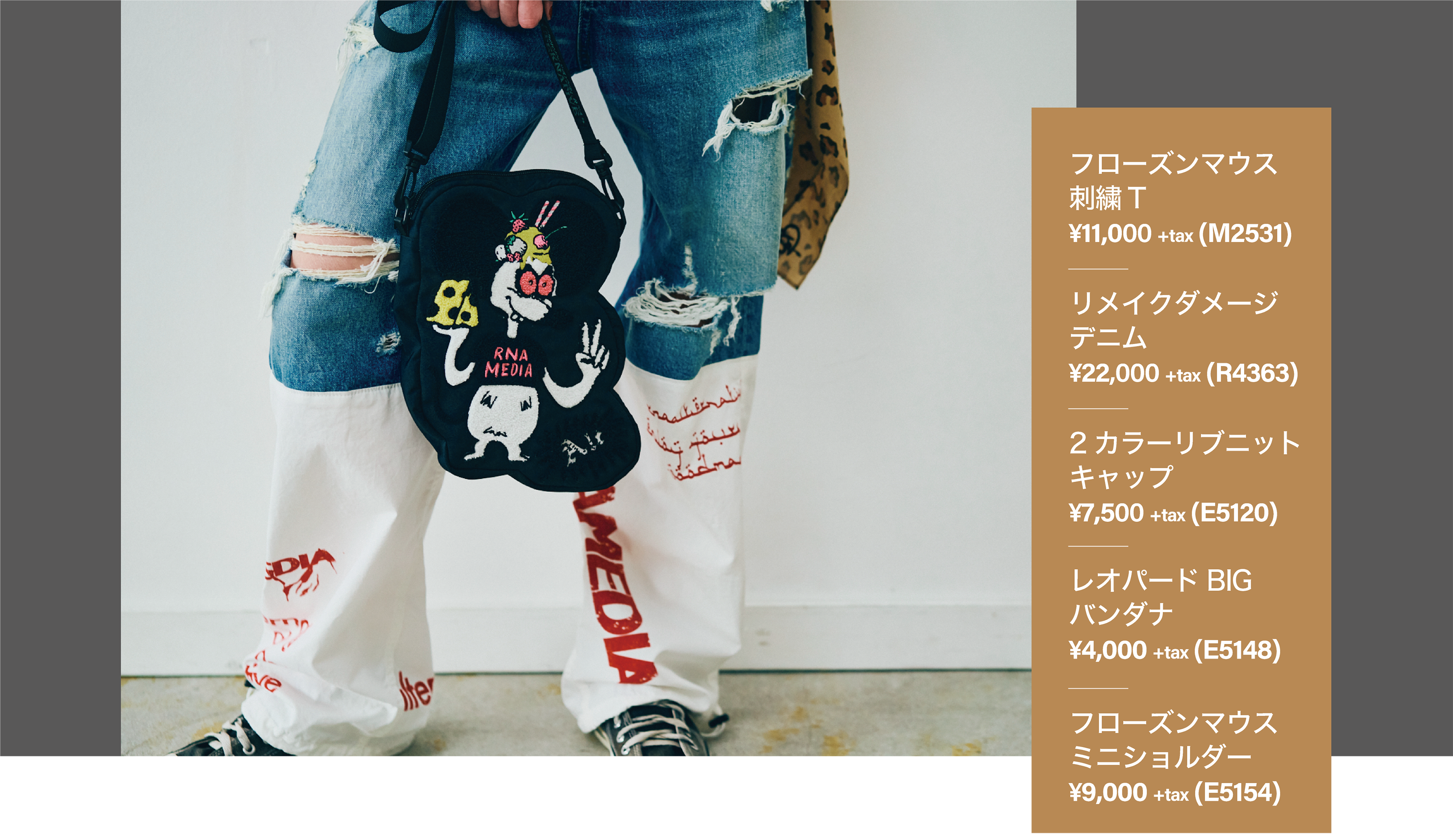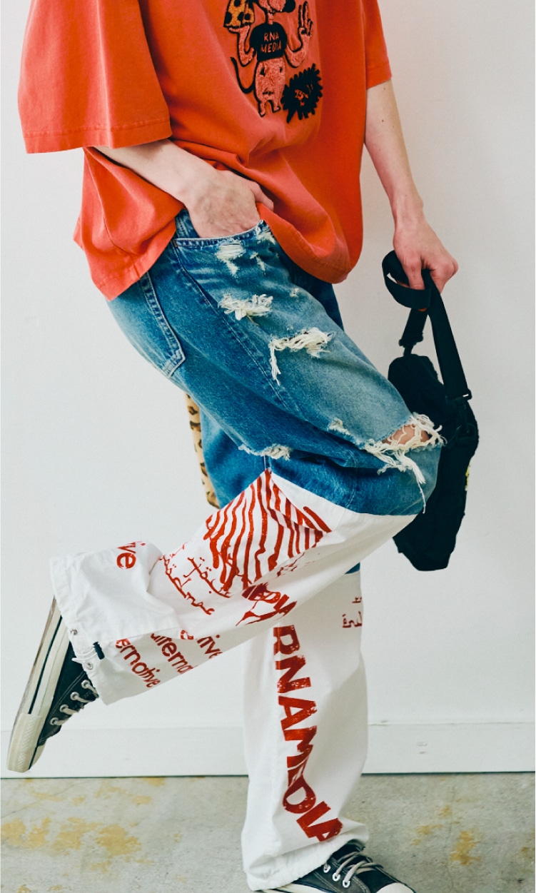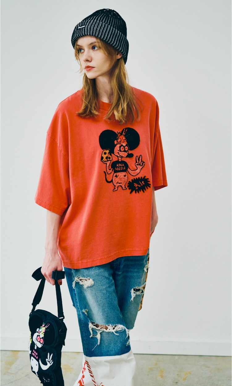 キッチュでB級感ただようキャラクターをパイル刺繍で落と し込んだワイドTに、ヴィンテージ加工のデニムとパラシュー ト素材を組み合わせたリメイクパンツを合わせた着こなし。 レオパード柄のバンダナと、Tシャツとリンクしたキャラデ ザインのバッグで、遊び心と統一感をプラス。個性が際立つ、 RNAらしいストリートスタイル。