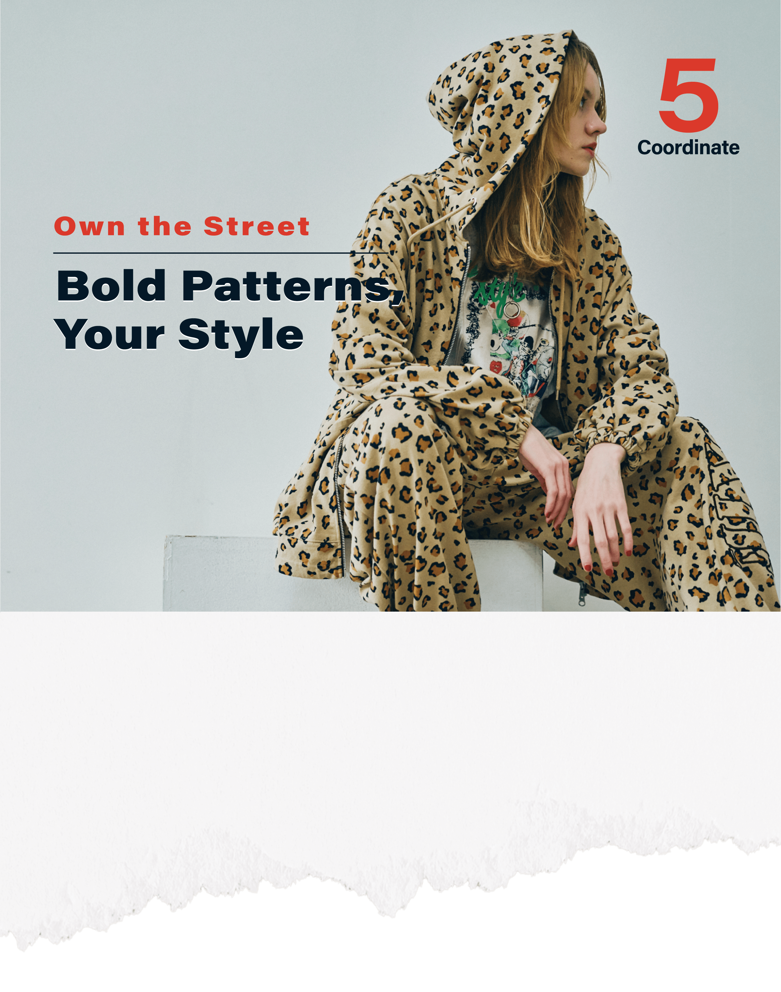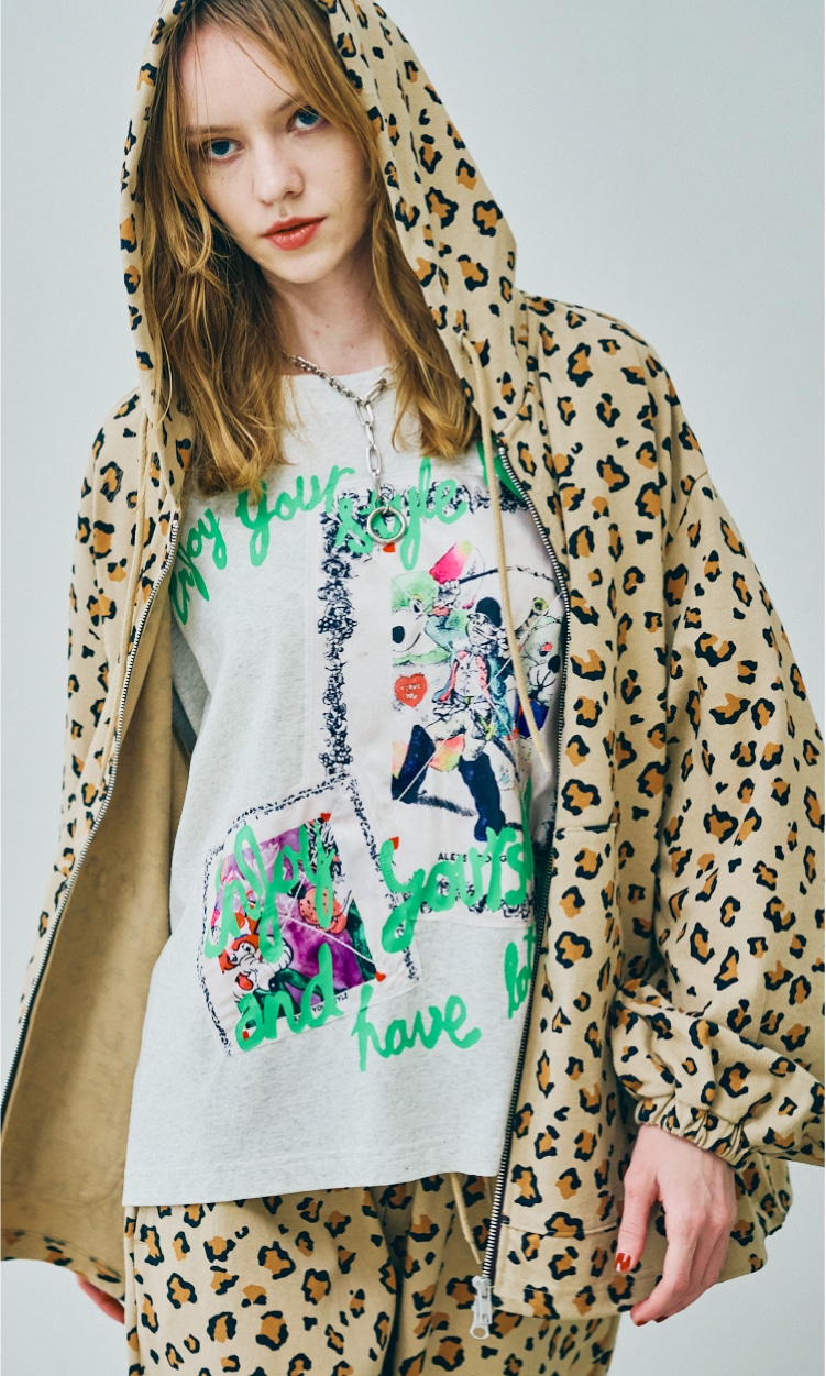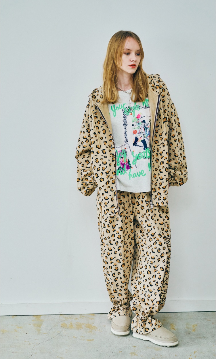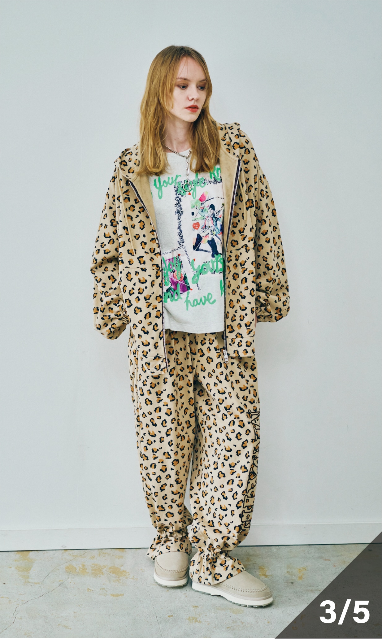 レオパード柄のZIP UPパーカーと、ボリューム感のある イージーパンツで魅せる、ストリート感漂う着こなし。インナ ーには光沢生地を大胆にパッチワークしたTシャツを合わせ、レオ パードとの相性も抜群。遊び心とエッジを効かせた、RNAな らではのセットアップスタイル。