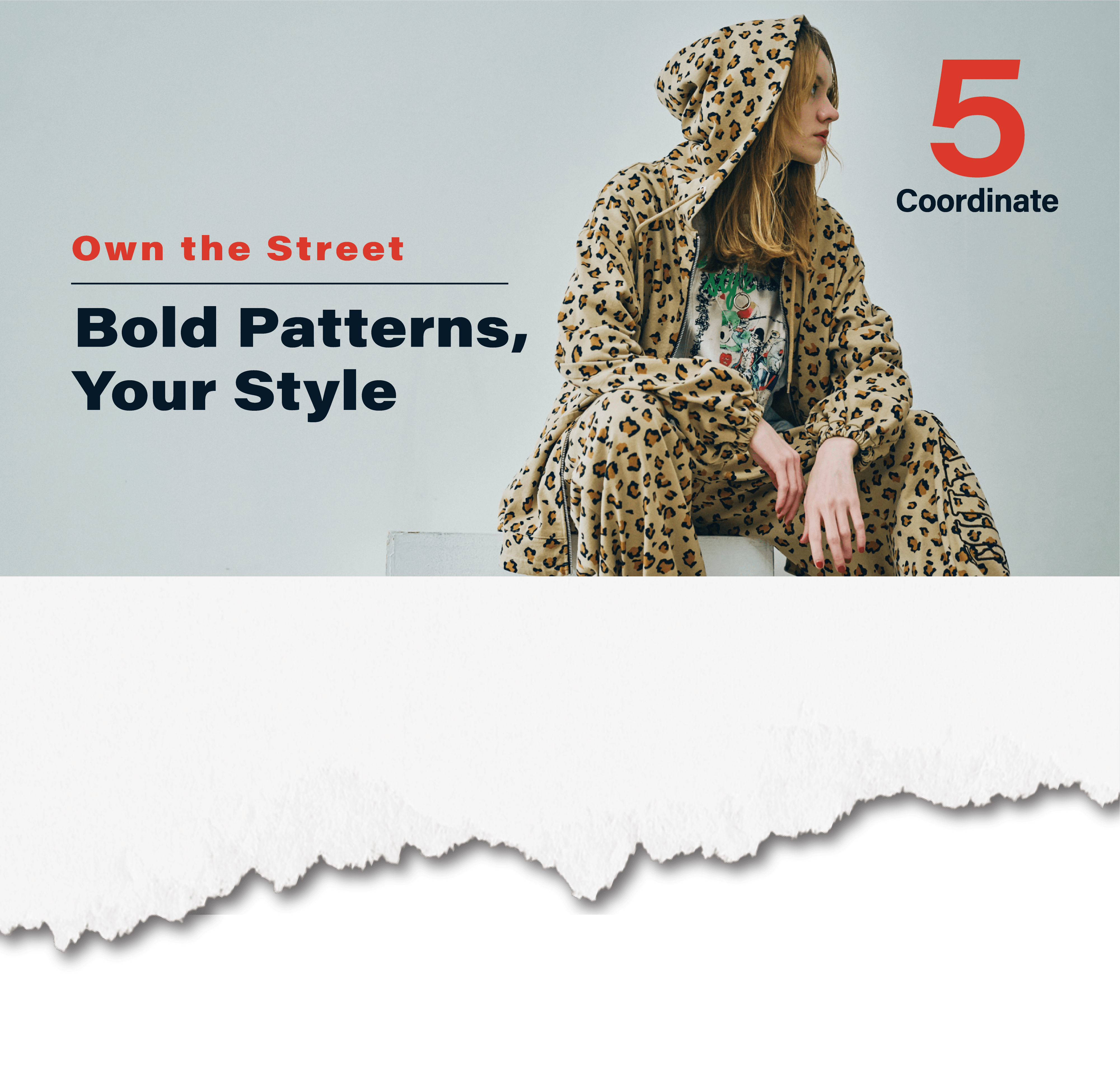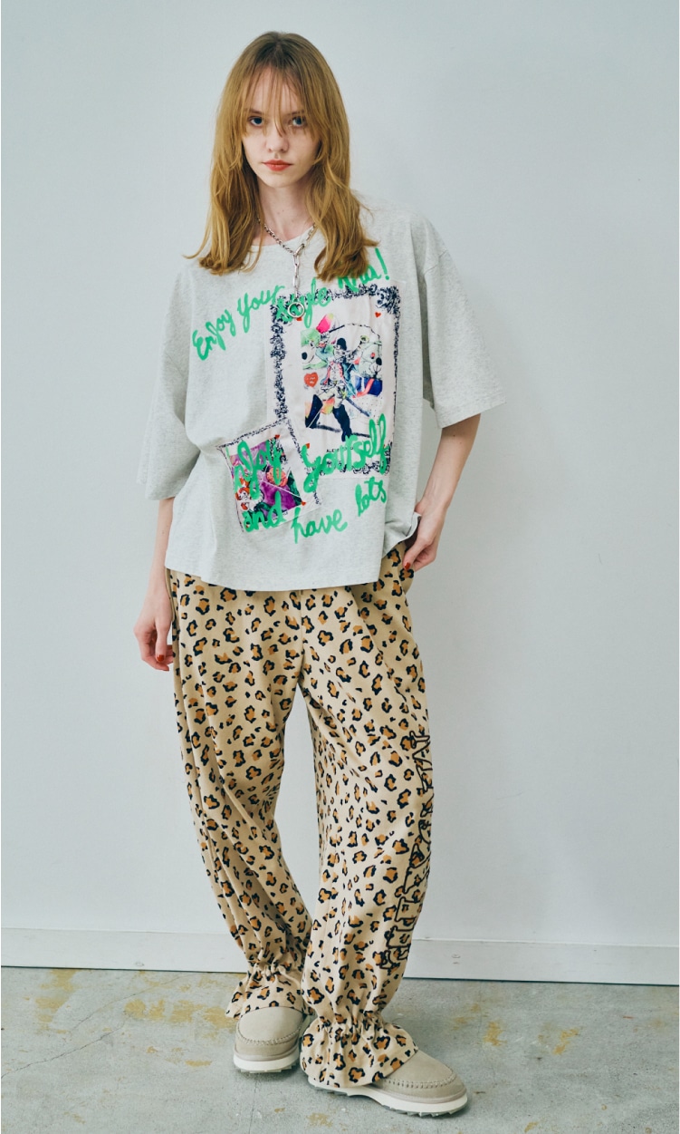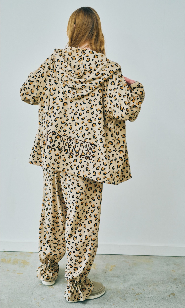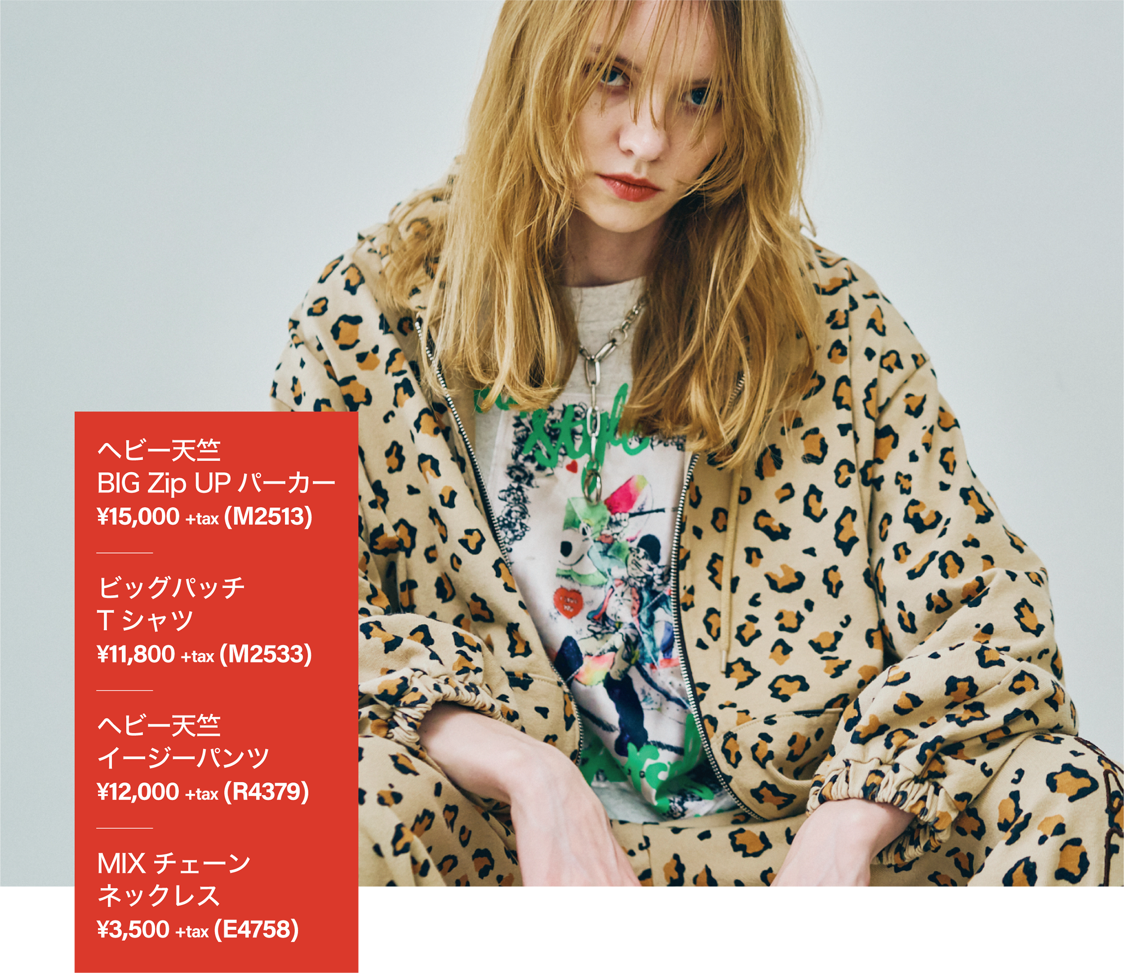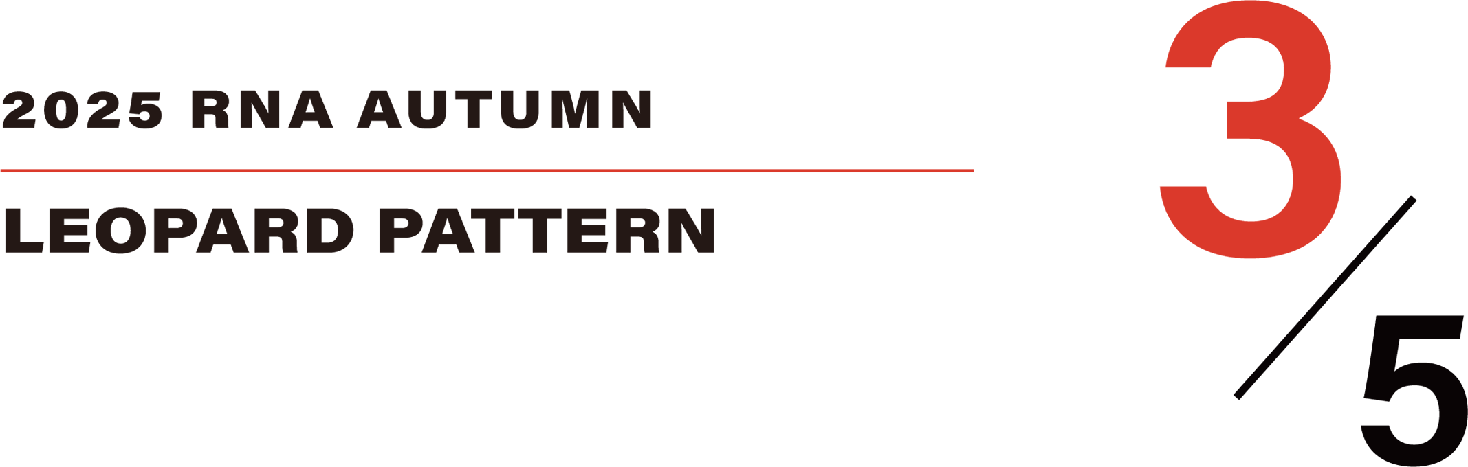 レオパード柄のZIP UPパーカーと、ボリューム感のある イージーパンツで魅せる、ストリート感漂う着こなし。インナ ーには光沢生地を大胆にパッチワークしたTシャツを合わせ、レオ パードとの相性も抜群。遊び心とエッジを効かせた、RNAな らではのセットアップスタイル。