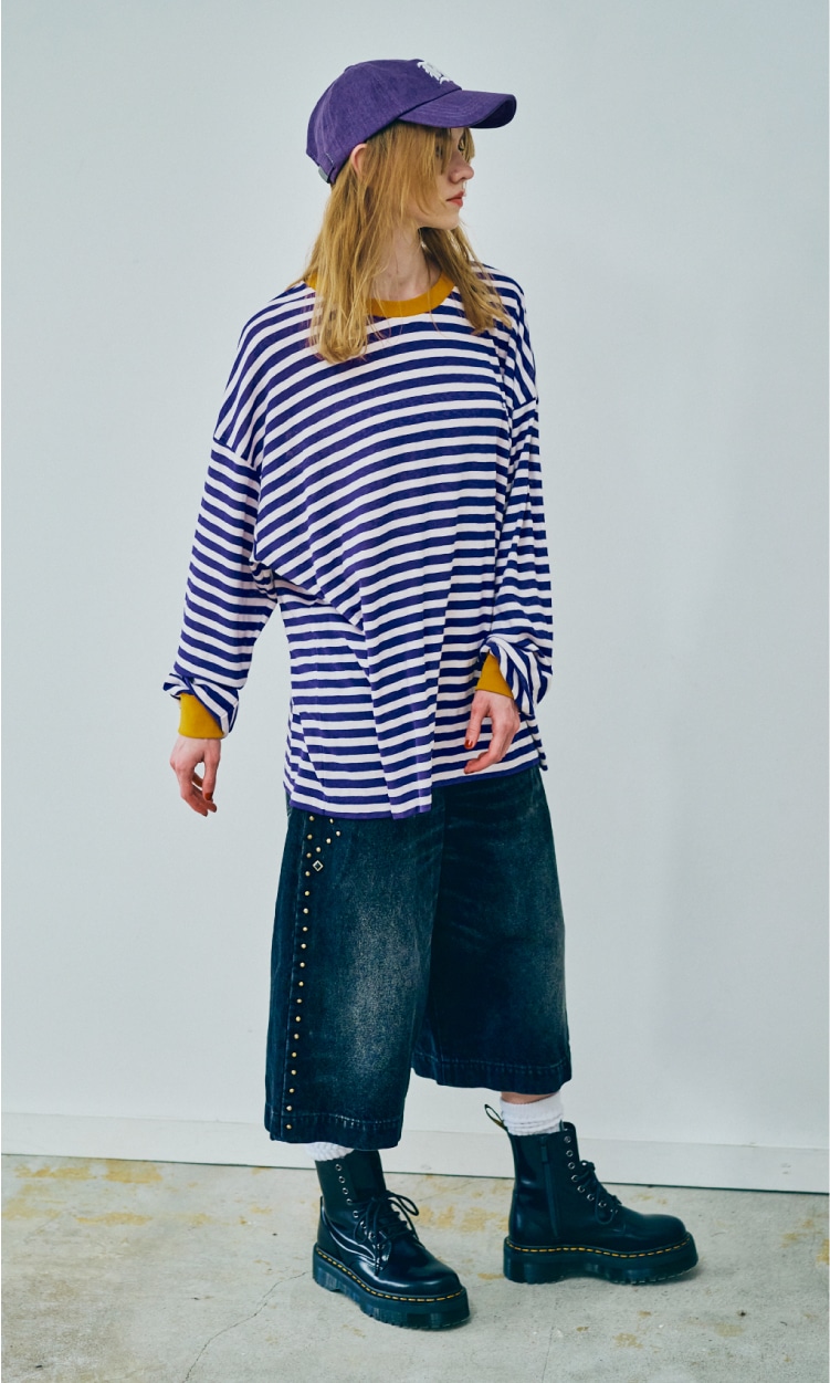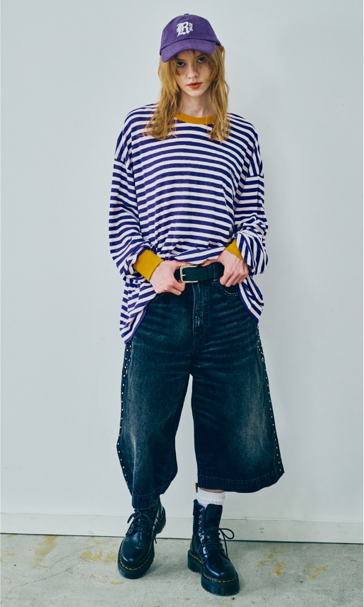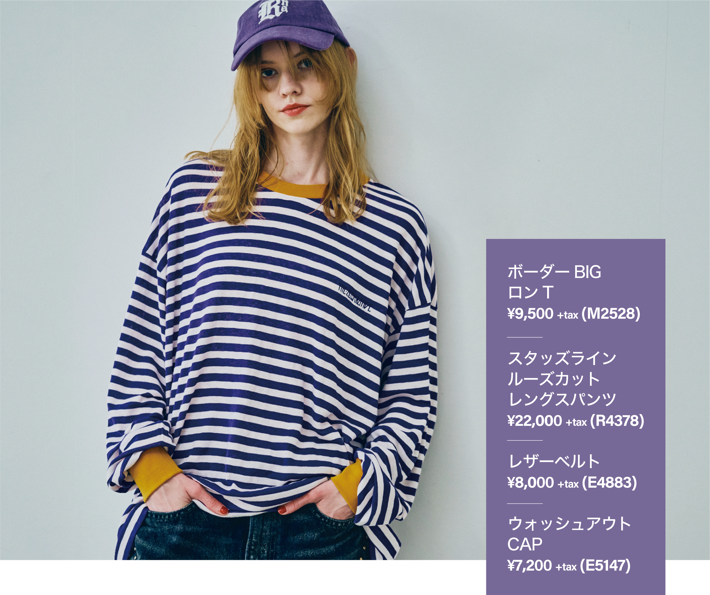 ボーダーロンTにルーズなサイズ感のカットレングスパンツ を合わせたカジュアルスタイル。一見シンプルに見えて、実 は透け感の異なる素材を組み合わせたトップスや襟・袖口の アクセントカラーが効いたこだわりの1枚。パンツはラフな 着丈と加工感に加え、サイドのスタッズラインがほどよいエッ ジをプラス。足元には重めのブーツを合わせて、抜けすぎな いバランスに仕上げるのがおすすめ。