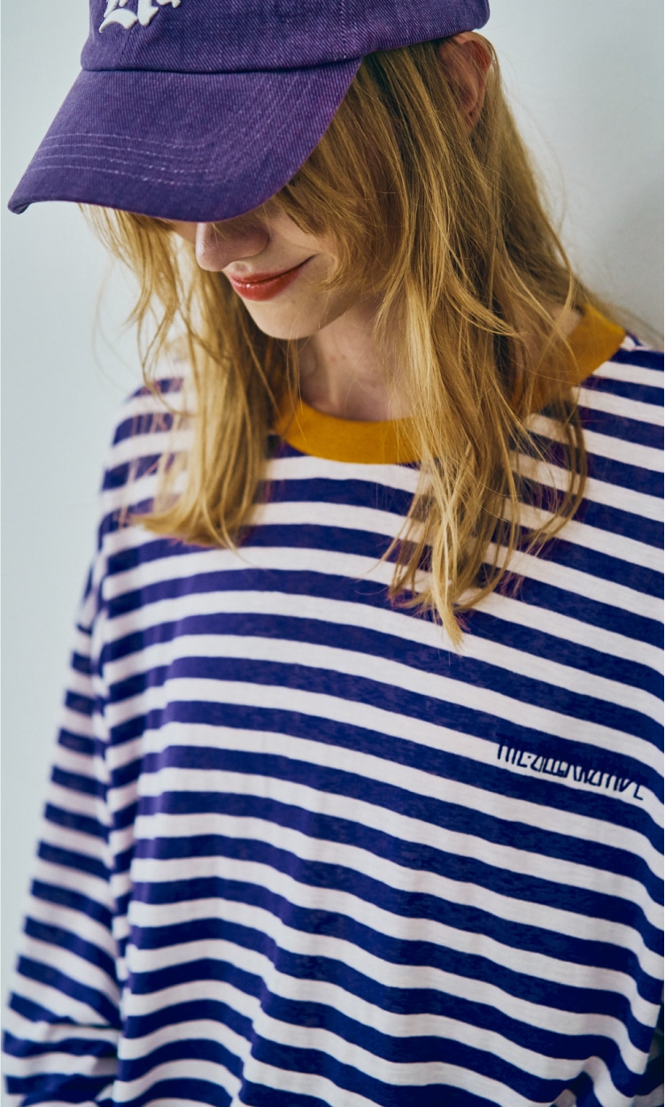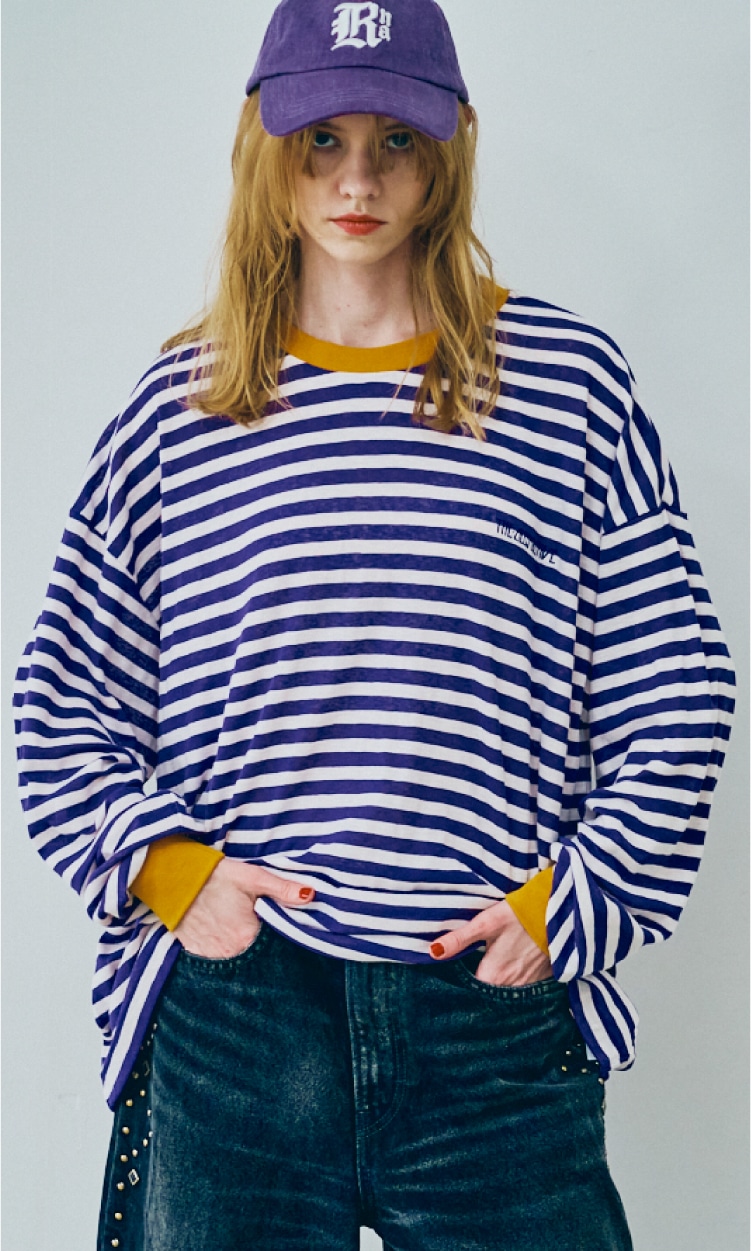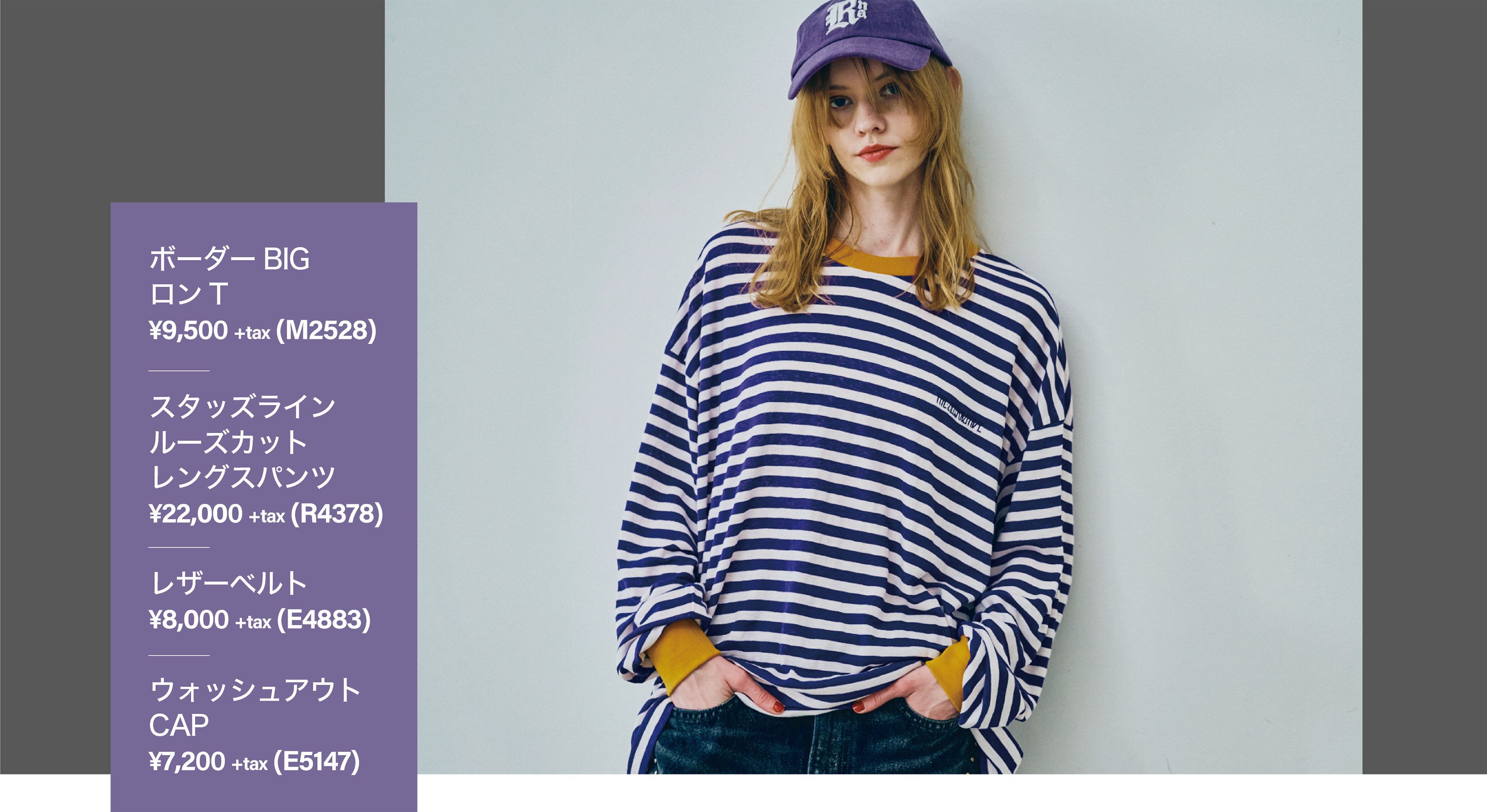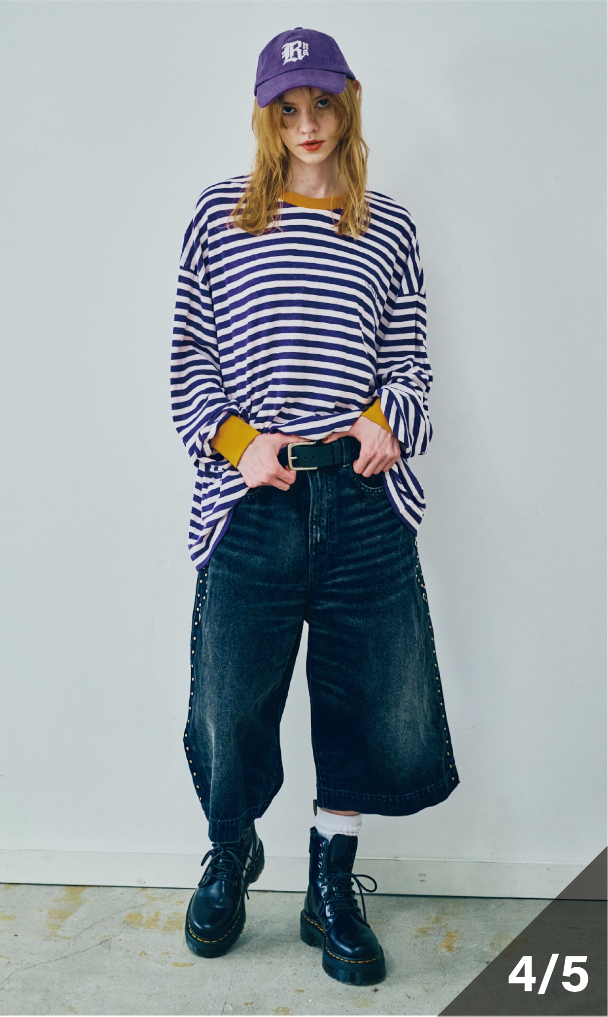 ボーダーロンTにルーズなサイズ感のカットレングスパンツ を合わせたカジュアルスタイル。一見シンプルに見えて、実 は透け感の異なる素材を組み合わせたトップスや襟・袖口の アクセントカラーが効いたこだわりの1枚。パンツはラフな 着丈と加工感に加え、サイドのスタッズラインがほどよいエッ ジをプラス。足元には重めのブーツを合わせて、抜けすぎな いバランスに仕上げるのがおすすめ。