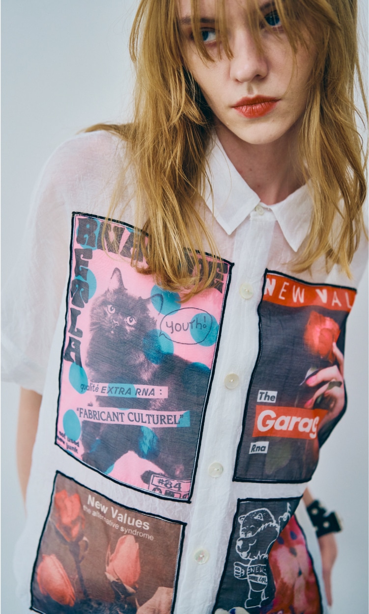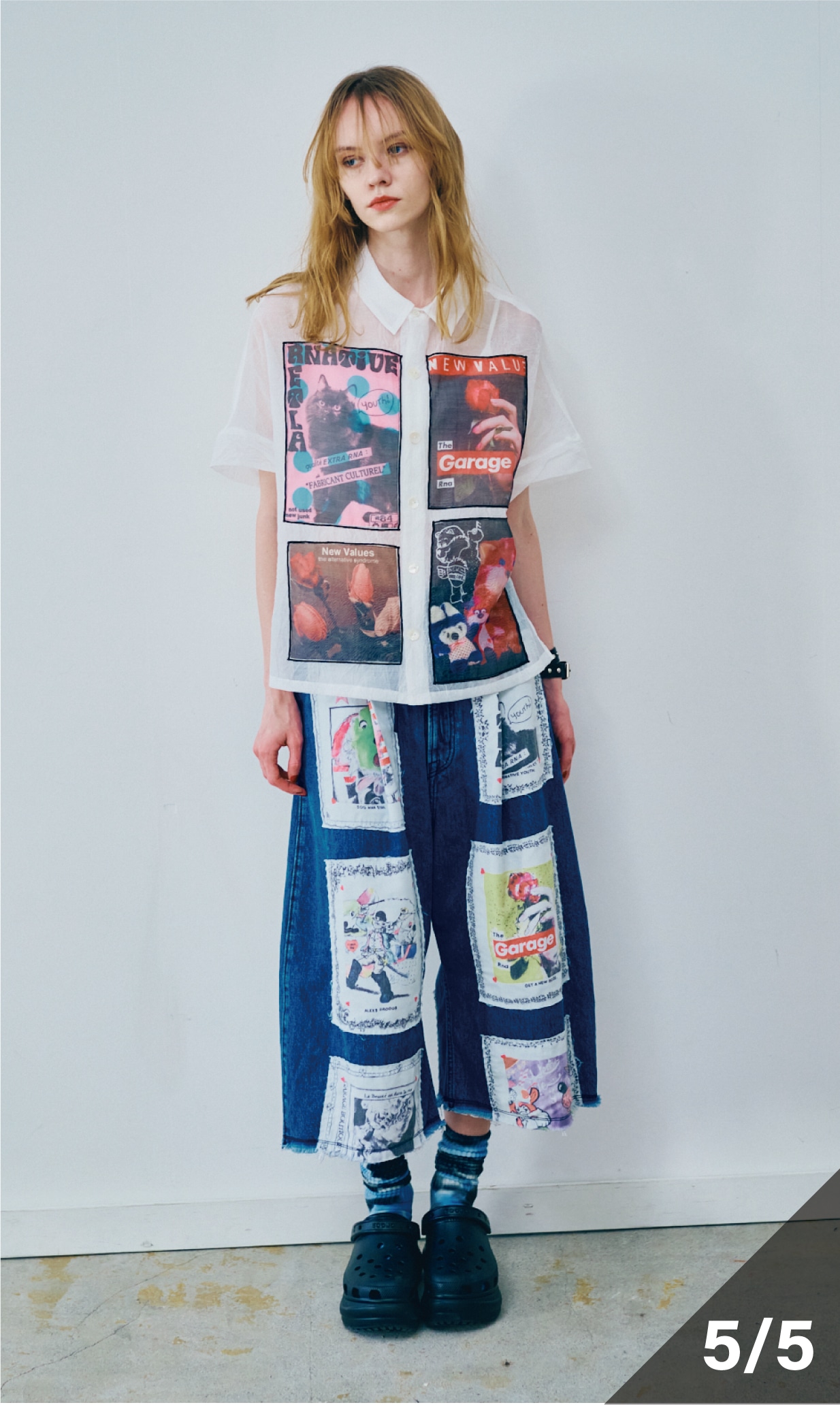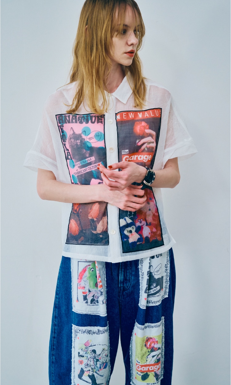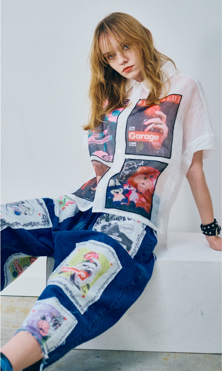 大胆なグラフィックパッチを叩きつけたシャツとパンツで、 存在感抜群のストリートスタイル。シャツは透け感のある軽 やかな素材に、小ぶりな襟と絶妙なオーバーサイズで抜け感 を演出。パンツは5ポケットをベースに、パターンでひねり を効かせた立体的なカーブシルエットがポイント。足元には 厚底シューズを合わせて、全体にボリュームとバランスを加 えた仕上がり。