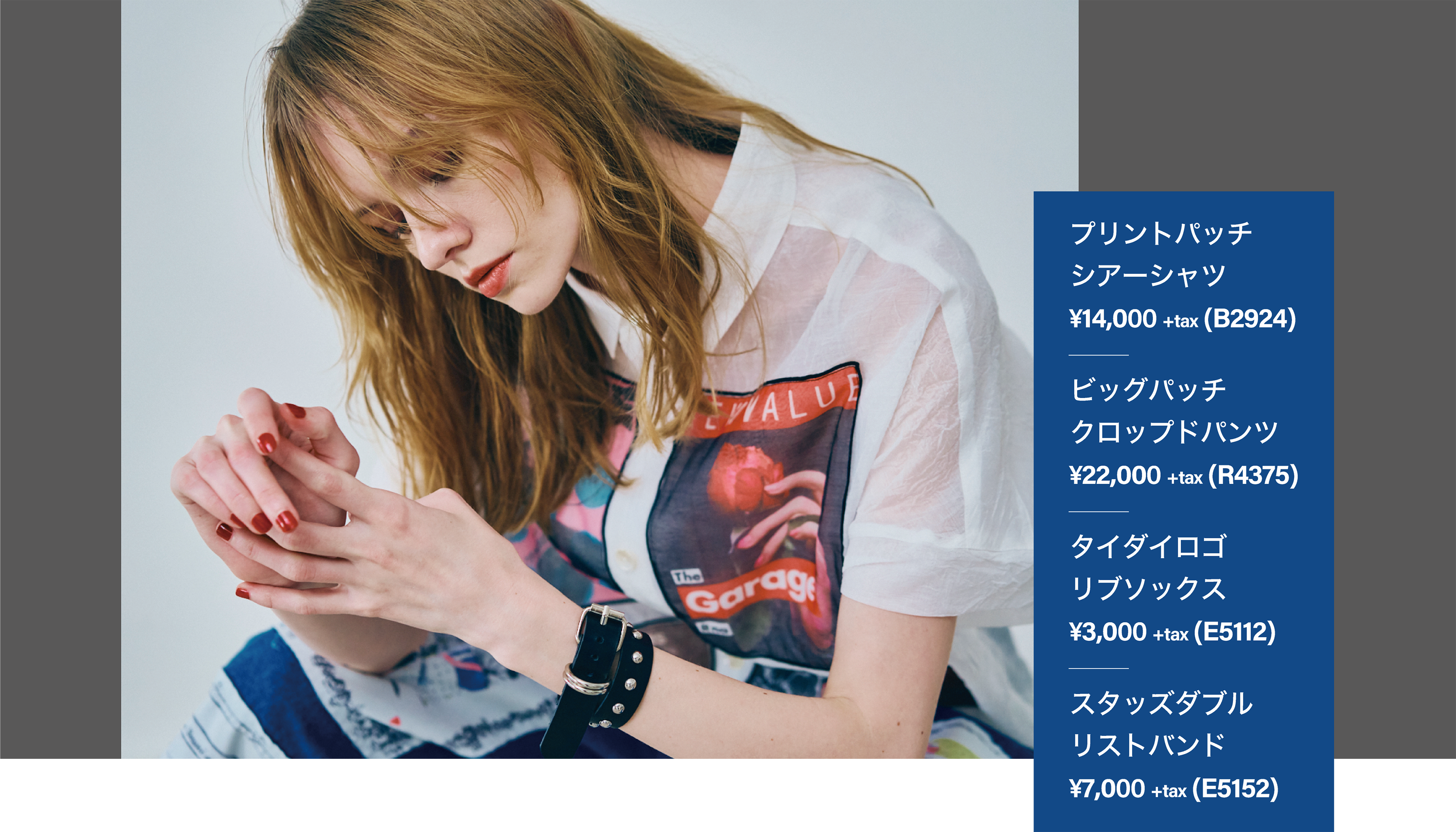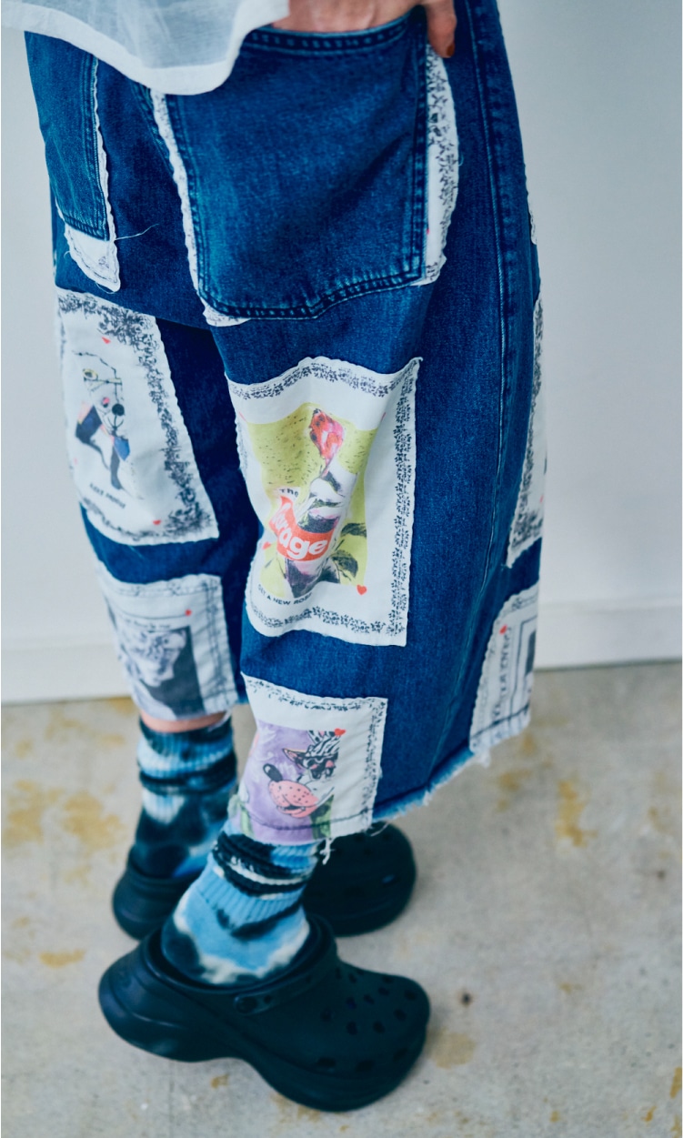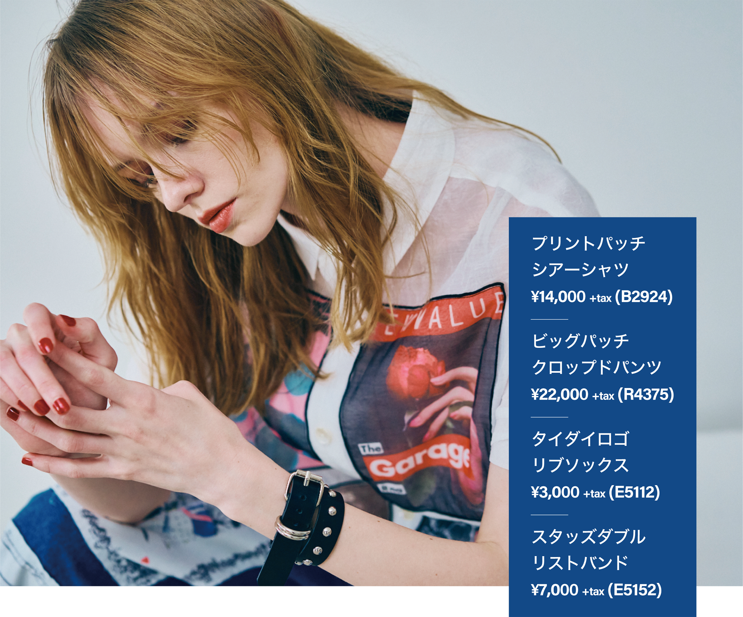 大胆なグラフィックパッチを叩きつけたシャツとパンツで、 存在感抜群のストリートスタイル。シャツは透け感のある軽 やかな素材に、小ぶりな襟と絶妙なオーバーサイズで抜け感 を演出。パンツは5ポケットをベースに、パターンでひねり を効かせた立体的なカーブシルエットがポイント。足元には 厚底シューズを合わせて、全体にボリュームとバランスを加 えた仕上がり。
