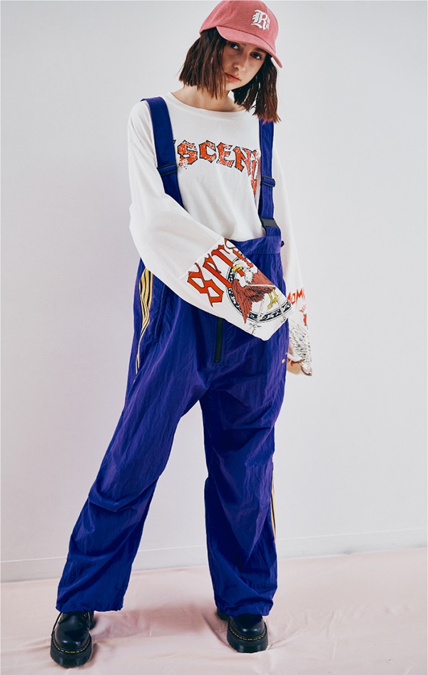パッチワーク風グラフィックのロンTとパープルにイエローラインが映えるナイロンオーバーオールの着こなし。ウエストのアジャスターを絞ればパンツとしても着られる2WAY仕様で、気分に合わせてシルエットチェンジができるのもポイント。スポーティ要素や素材感が楽しめる軽やかな着こなし。