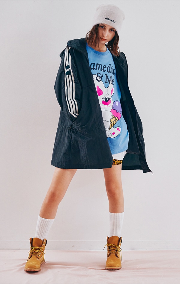 2WAYトラックジャケットを主役にした、春のNEO GRUNGEスタイル。ネコ&ウサギのBIGロンTを合わせて、クールな中にほんのり可愛さをプラス。“ストリート × グランジ”の絶妙バランスがRNAらしいスタイル。サイドライン入りのライトアウターは、コートにもワンピにもなる万能さが魅力。