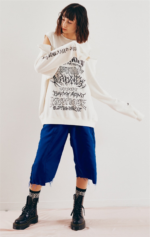 ラフな切りっぱなしの裾が春らしい抜け感をつくり、ブーツとのバランスも◎。バンドロゴ風トレーナーを主役に、ウェーブラインが映えるクロップドパンツを合わせたストリートMIX。動くたびに揺れるフリンジがメンズライクなNEO GRUNGEな印象に。