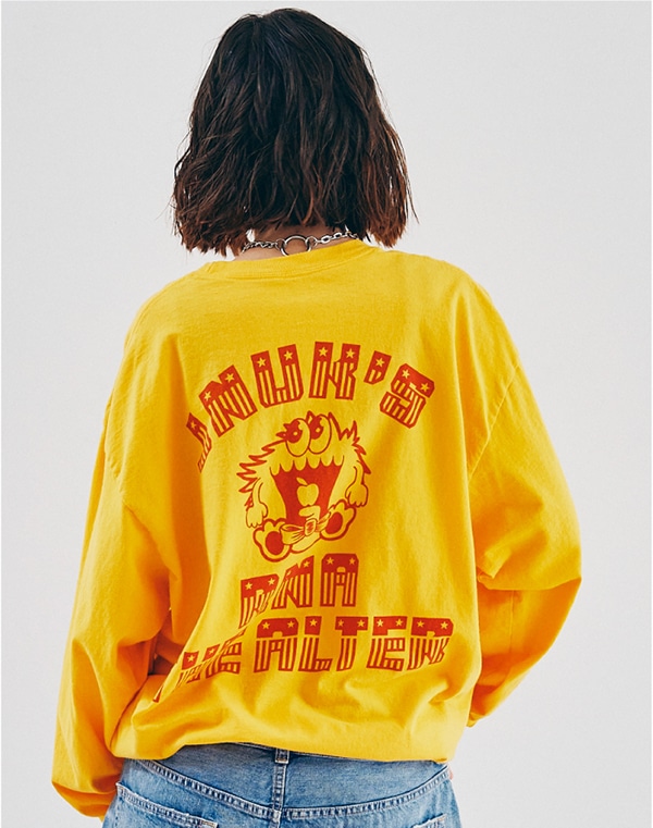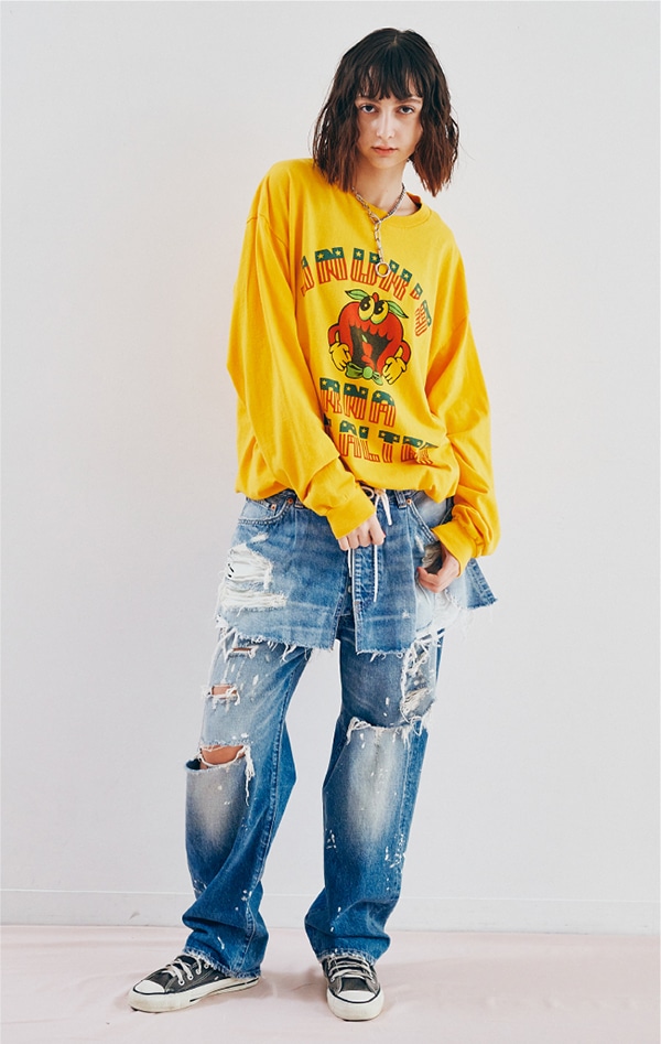 ビビッドカラーのポップさと、USED感が混ざり合ったRNAらしいジャンクスタイル。色褪せ感が古着っぽいロンTに、POPでキッチュなキャラクターグラフィックをオン。ダメージデニムのミニスカート×パンツのレイヤードを合わせて、ストリート感を楽しむ。