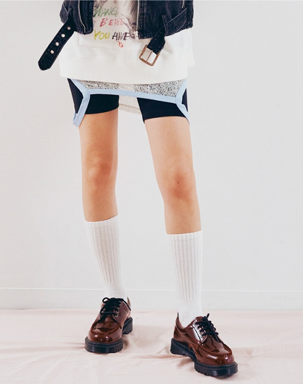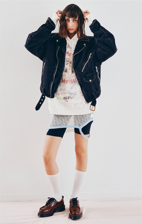 繊細なスケッチコラージュが映えるフーディから、レイヤードのチュールキャミワンピをちらり。ルーズな肩落ちとヴィンテージ感のある色落ちが、全体をこなれたNEO GRUNGEバランスに仕上げてくれる。その上から羽織るだけでムードが決まる主役アウター”BIGデニムライダース”をオン。