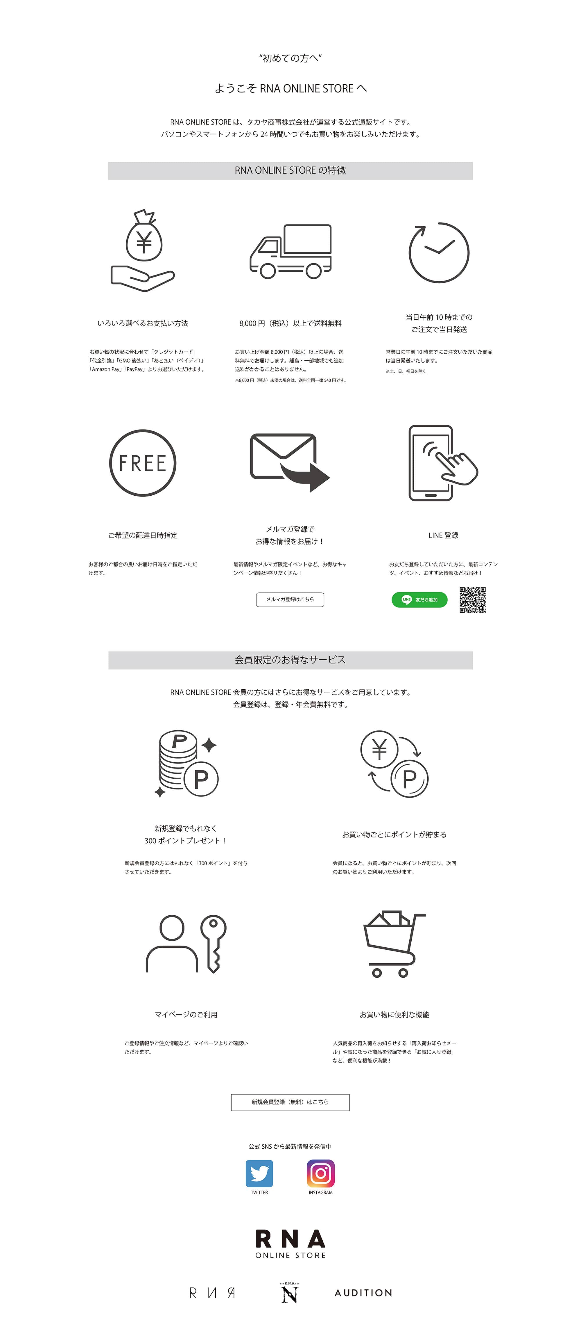 “初めてのお客様へ” ようこそ RNA ONLINE STOREへ RNA ONLINE STOREは、タカヤ商事株式会社が運営する公式通販サイトです。 スマートフォンやパソコンから24時間いつでもお買い物をお楽しみいただけます。 |