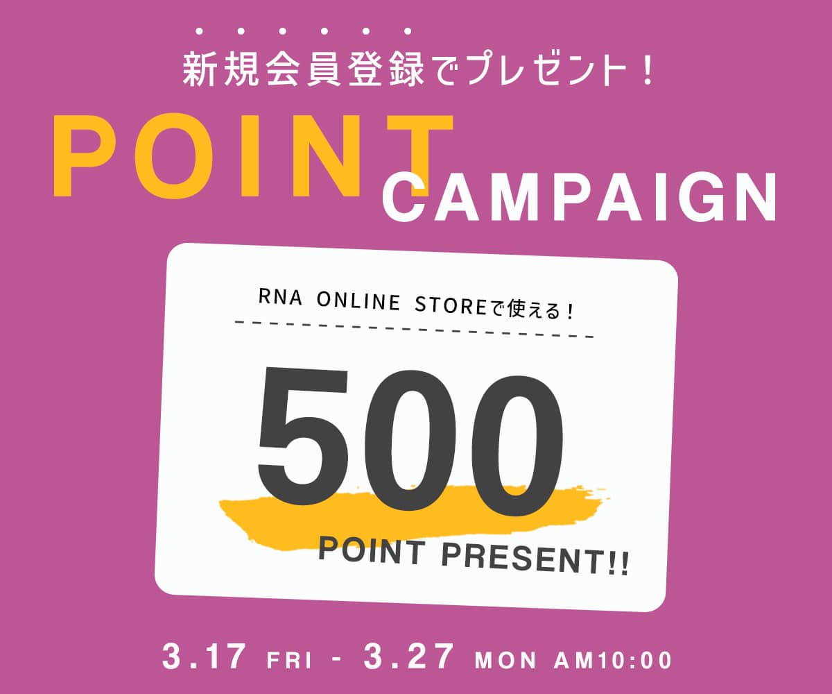 | ただ今、RNA ONLINE STOREにて 新規会員登録を行なって頂いた方に 500ポイントをプレゼント中! 〈期間〉 2023年3月17日(金)AM10:00 | 2023年3月27日(月)AM10:00 会員様限定セールなど イベントも不定期で行なっております。 ご登録をお待ちしております。 |